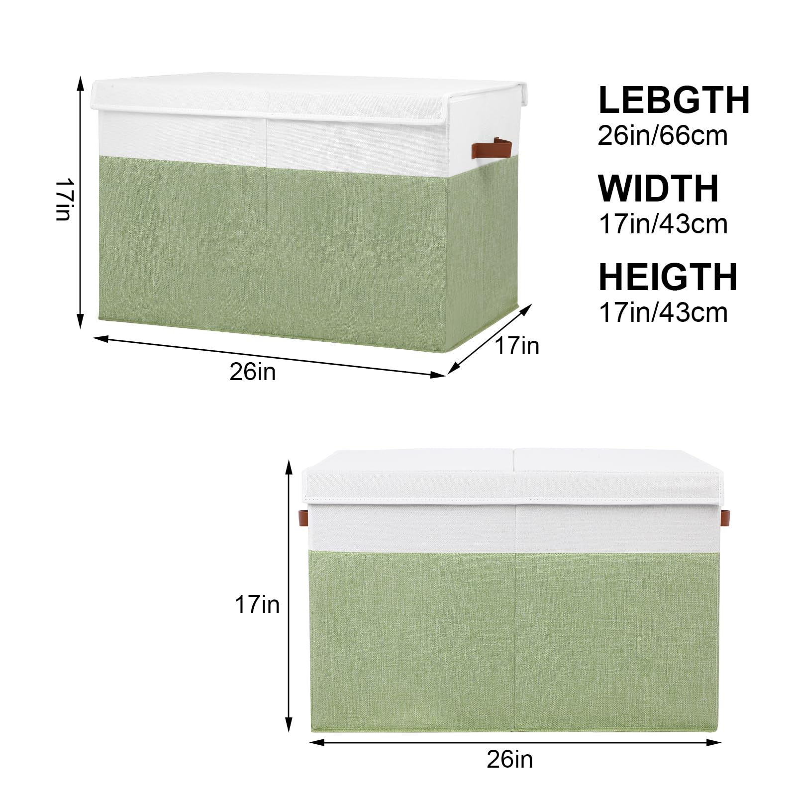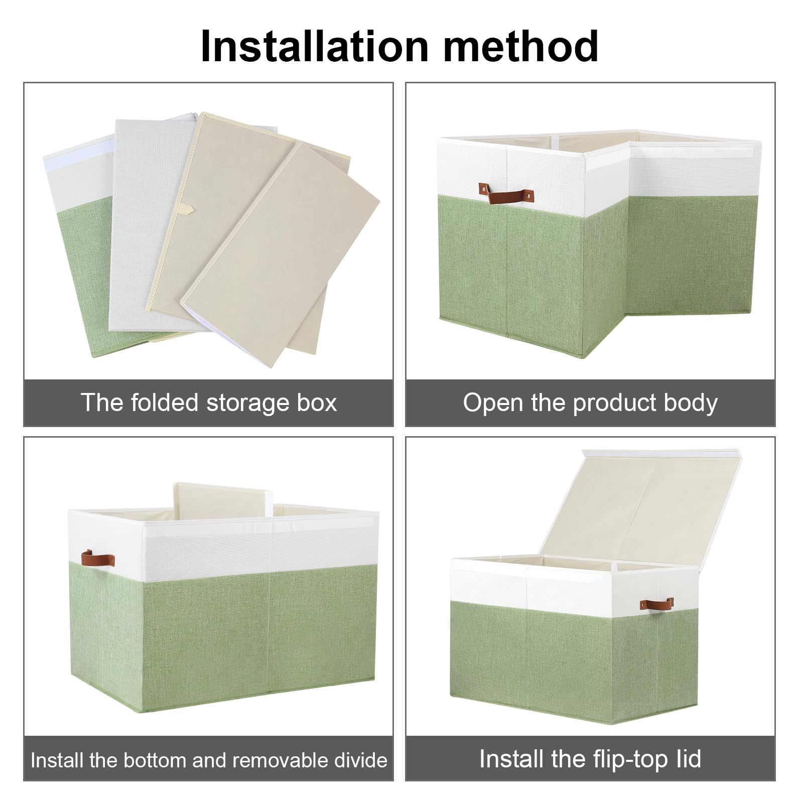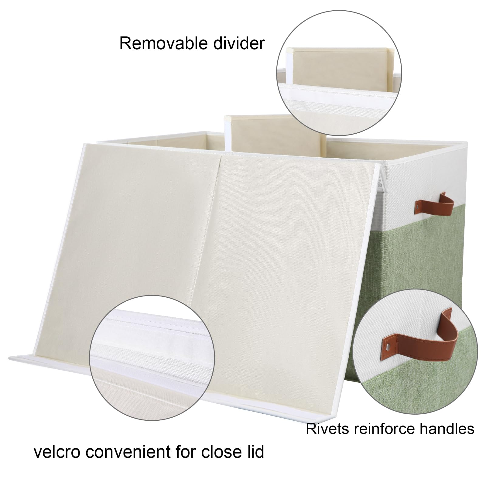 ADVANTAGES: Removable divider board : Great for organizing different items, you can detach the divider for store bigger things Flip-top lid : Keep your items away from dust, open the lid can also be used as an open box Rivets Reinforcement Handles : you can easily carry the large storage basket around your home Collapsible : When not in use, allowing you fold it flat, easy store or carrying Stackable : The toy boxes has a sturdy top, bottom and side, you can stack them SPECIFICATIONS: Color: Green&white External material: Polyester linen Upholstery Material: Non-woven fabric Construction Material: Environmentally cardboard Product Size: 26"x17" x17" MULTI-PURPOSES: Closet clothes storage Bathroom sundry storage Shelf organizers Car / vehicle grocery containers Nursery toy storage Bedroom comforters, blankets storage Kitchen & pantry snacks and dry foods storage Office document storage Laundry room cleaning supplies storage ABOUT OUR SERVICES If for any reason you're not completely happy with your purchase, please reach out and we will resolve issues and ensure your contentment.