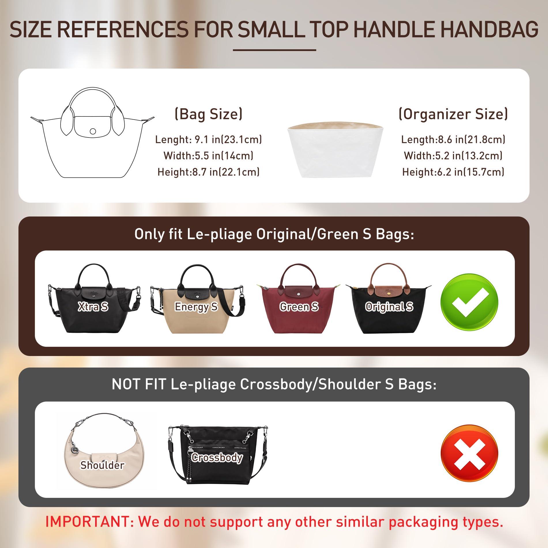 How to Choose the Right Size? The Small size (8.6" W * 5.2" D * 6.2" H) is suitable for the le pliage Small handbag, such as energy, collection, xtra, original and green small top handle bag , Speedy 25, Carryall PM and more. NOTE: W*D*H refers to Length*Width*Height. The small bag organizer insert for long champ is also suitable for othe bags, please MEASURE your bag's interior dimensions before buying for a perfect fit