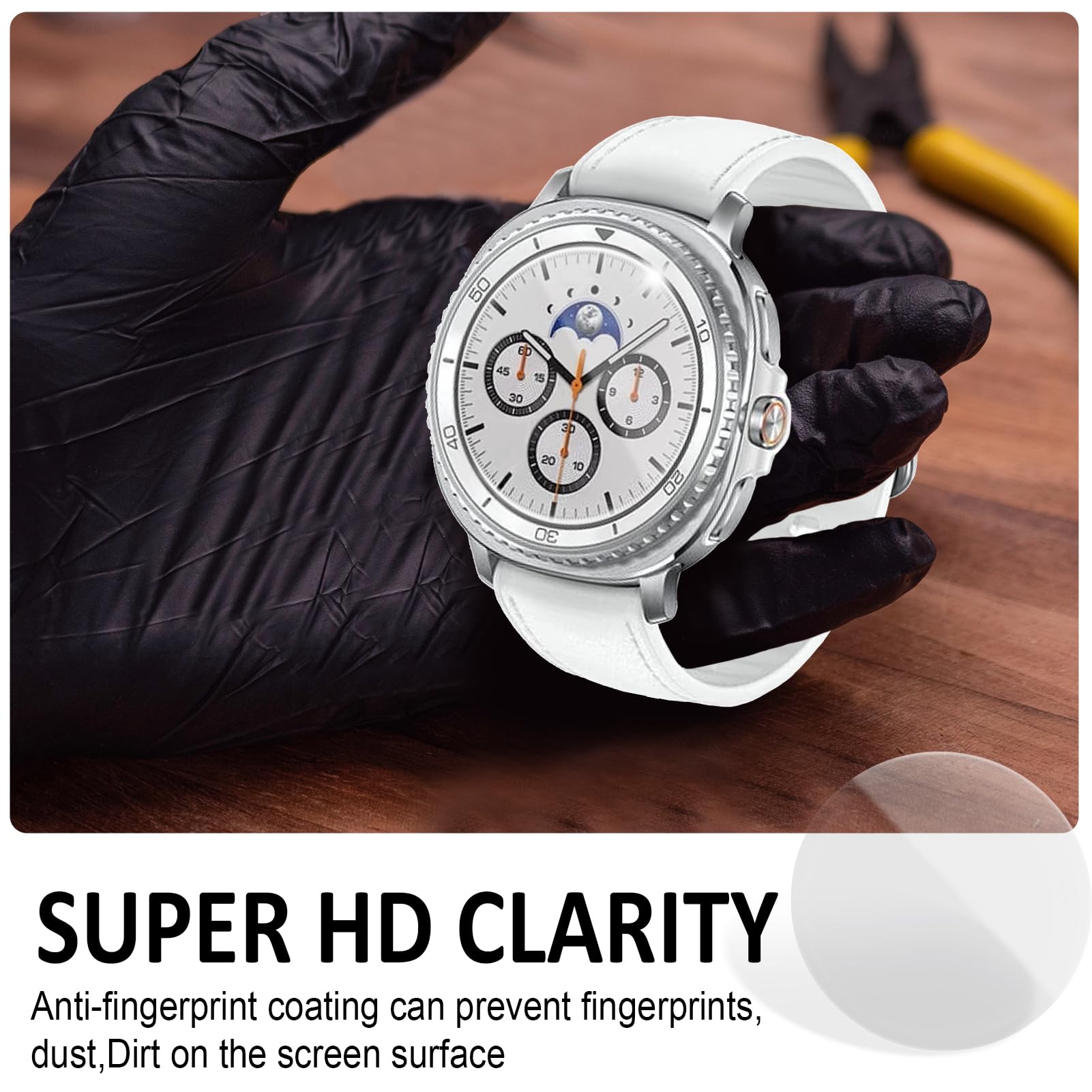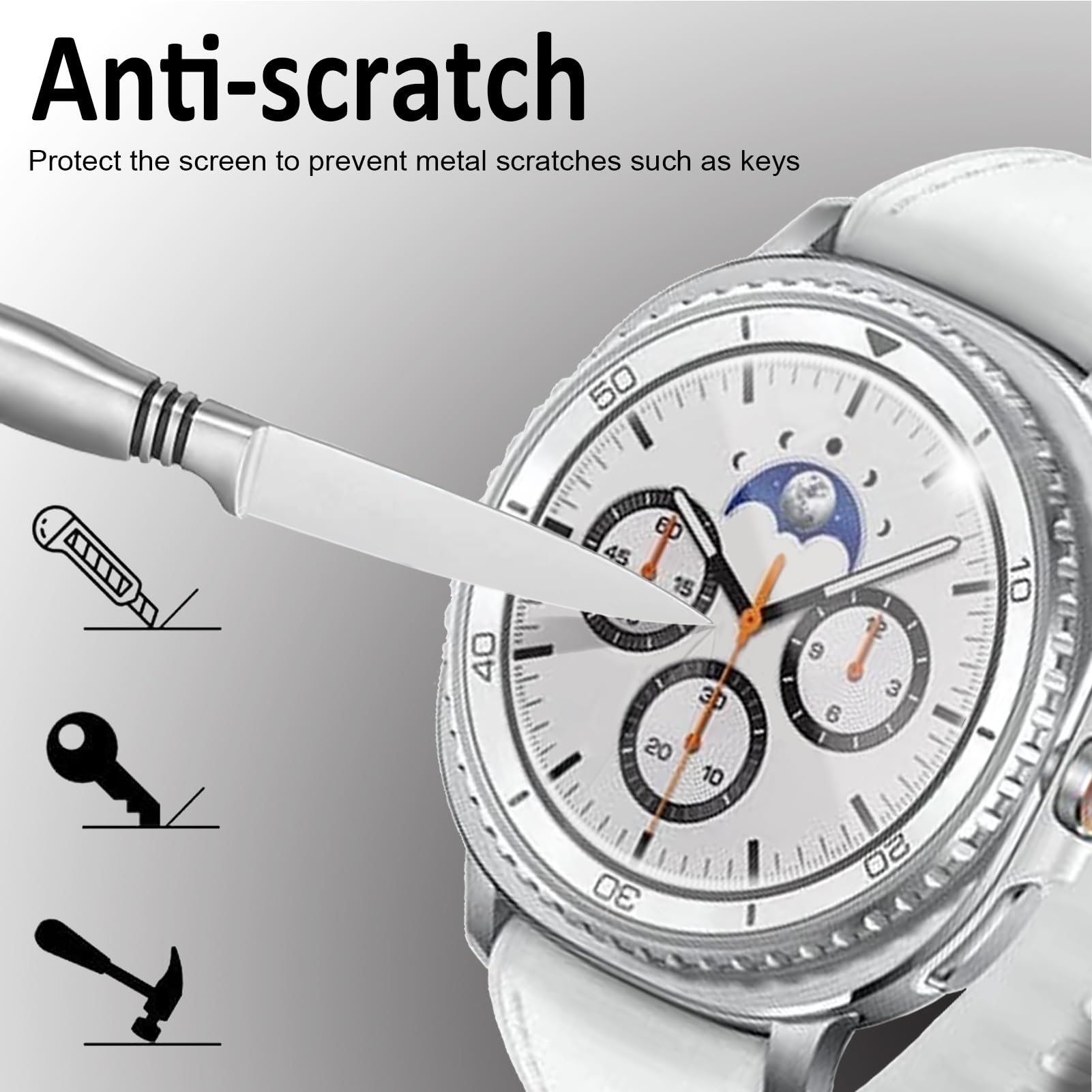 【Military-Grade Tempered Glass Protection】Made from premium 9H hardness tempered glass, this Galaxy Watch 8 Classic protector defends against scratches, impacts, and daily wear. The shock-absorbing layer provides enhanced drop protection while maintaining your watch's slim profile and premium appearance. Ideal for active lifestyles and demanding environments.
