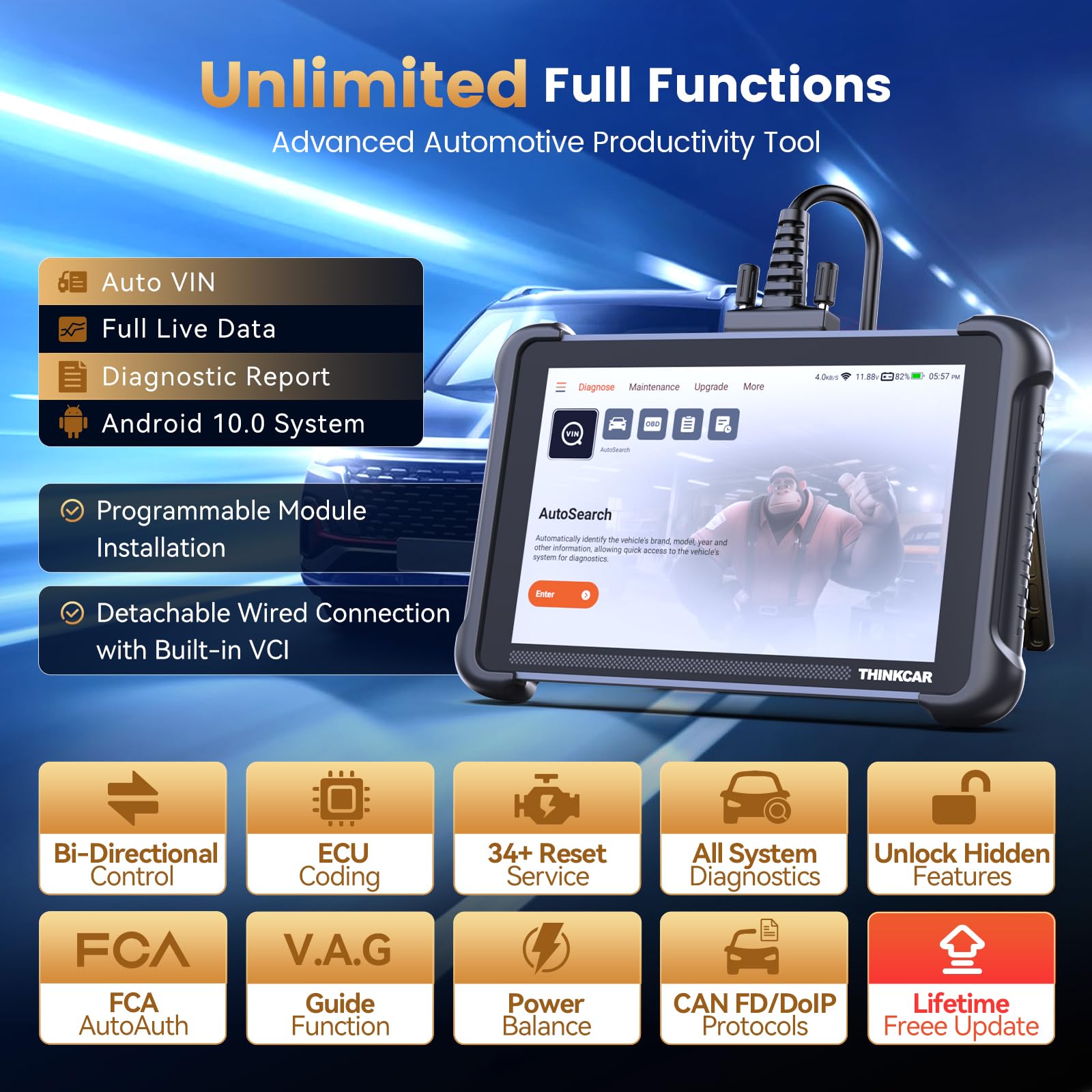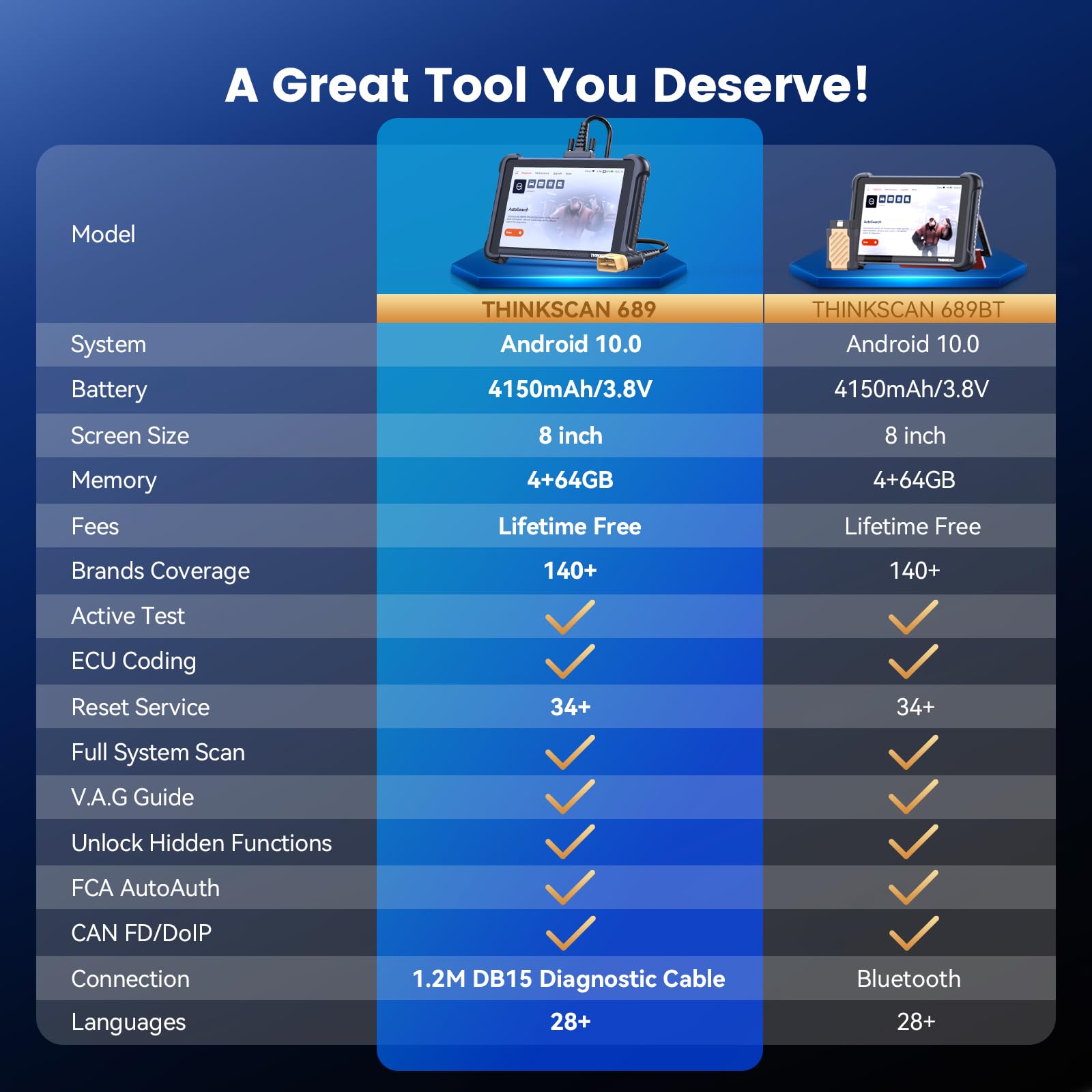 【Professional Car Diagnostic Tool】Tired of renew fees? Thinkscan 689 scanner provides dealer-level advanced functions for lifetime f.r.e.e update for auto mechanics and repair shops. 34+ Services, 3000+ Active Test, ECU Coding, 140+ Brands Coverage, FCA AutoAuth, CANFD&DOIP Protocol, Component Matching, Power Balance, V.A.G Guided, Compatible with Google Chrome integration, etc. With strong hardware backing, 64G Memory, Android 10, 4-core processors, and 4150mAh battery. Thinkscan 689 brings you the best as your daily business helper and never lets you drop the ball!