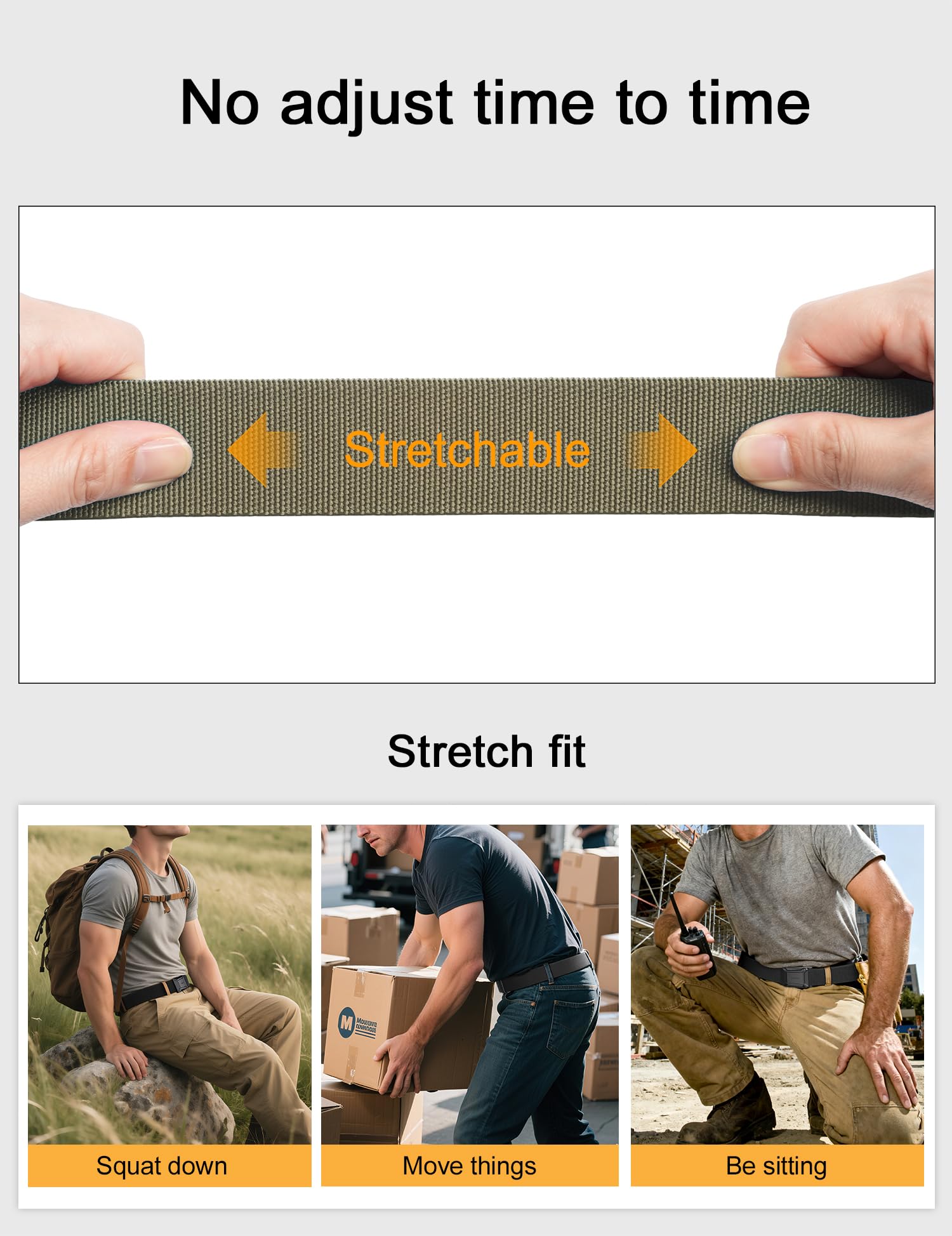HIGH QULITY STRETCH NYLON: The strap is made by special stretch material which is more solid than regular belt. More than that, it is very sturdy as well as stretch, which make your waist be more comfortable as well as stay tight, when you take large range of activities. Anyone who do physical activities for a long period of hours will get a great use out of the tactical belt