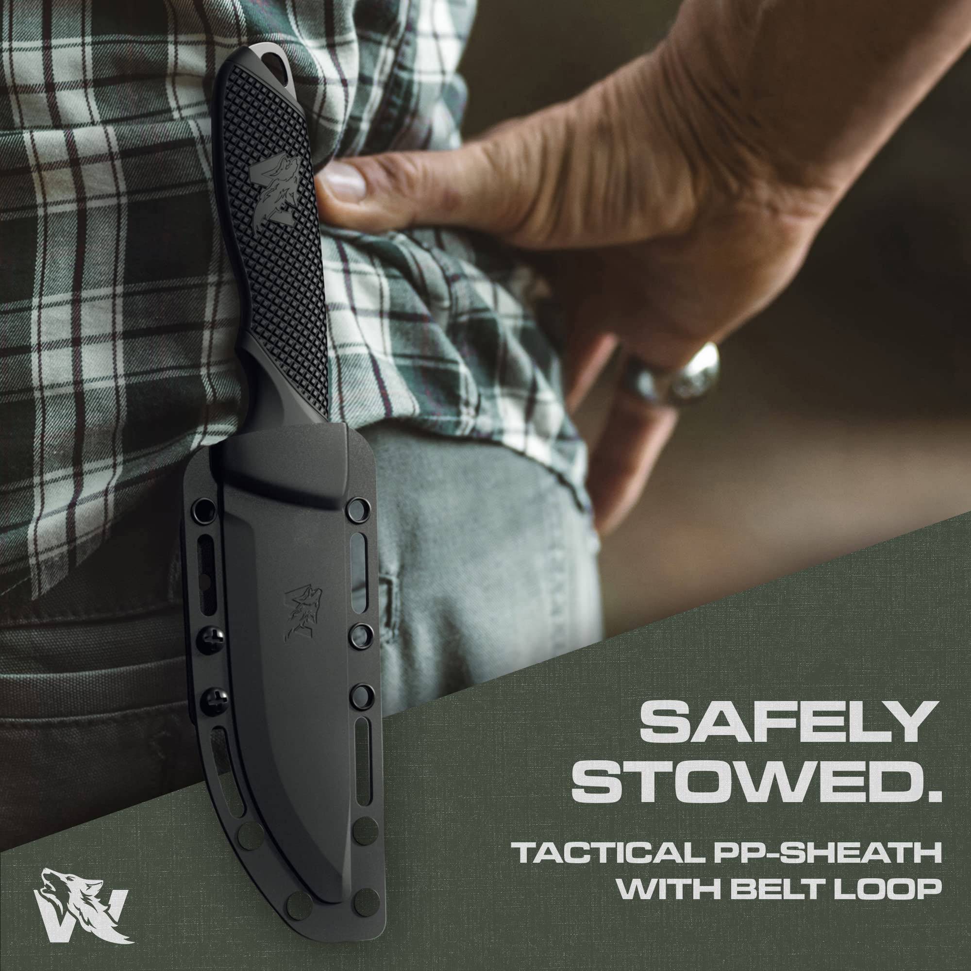 TACTICAL SHEATH - The bushcraft survival knife comes in a sexy tactical sheath made of polypropylene and can be securely locked in it. The sheath can be comfortably hung on your belt. Always safe and handy when you need the belt fixed blade knife.