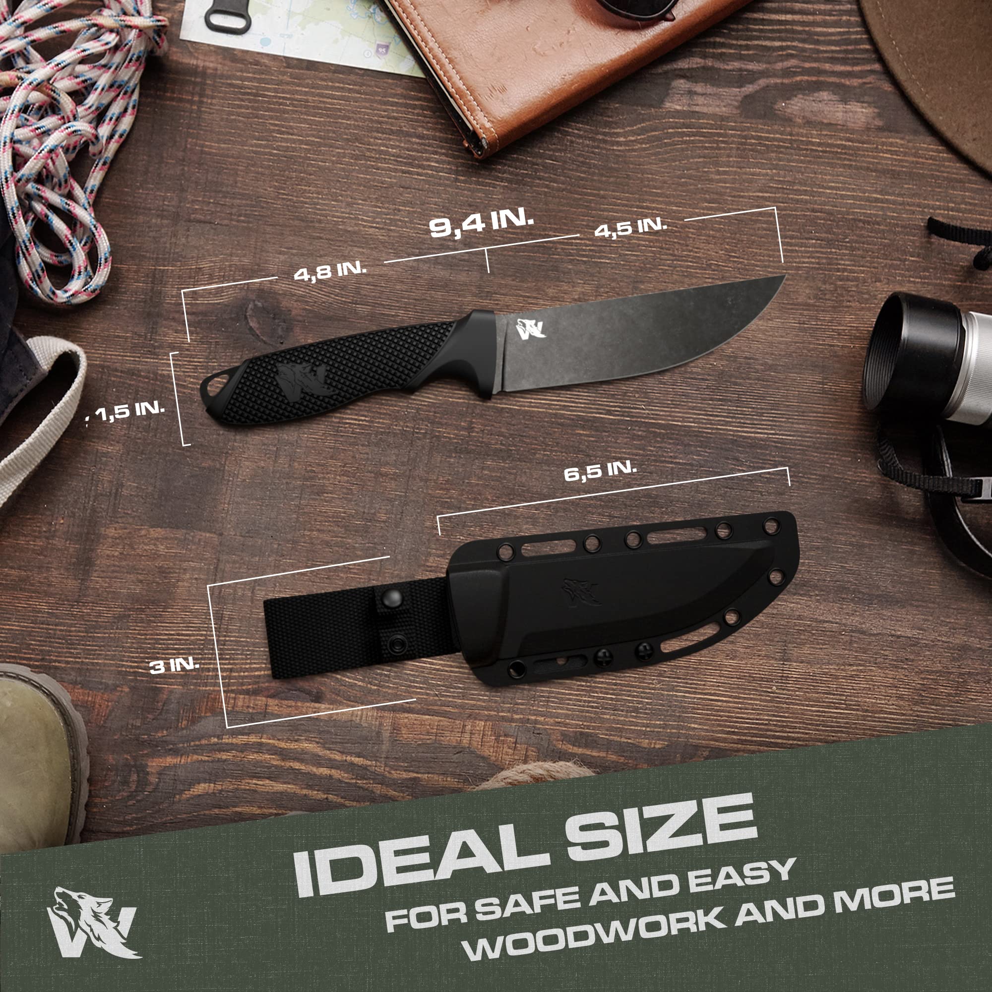 HIGH-QUALITY MATERIAL - The fixed blade hunting knife with sheath is made of a single piece of strong D2 steel (60 HRC). It's known for its exceptional hardness and wear resistance. An ideal choice for full tang knives, ensuring durability in rugged environments.