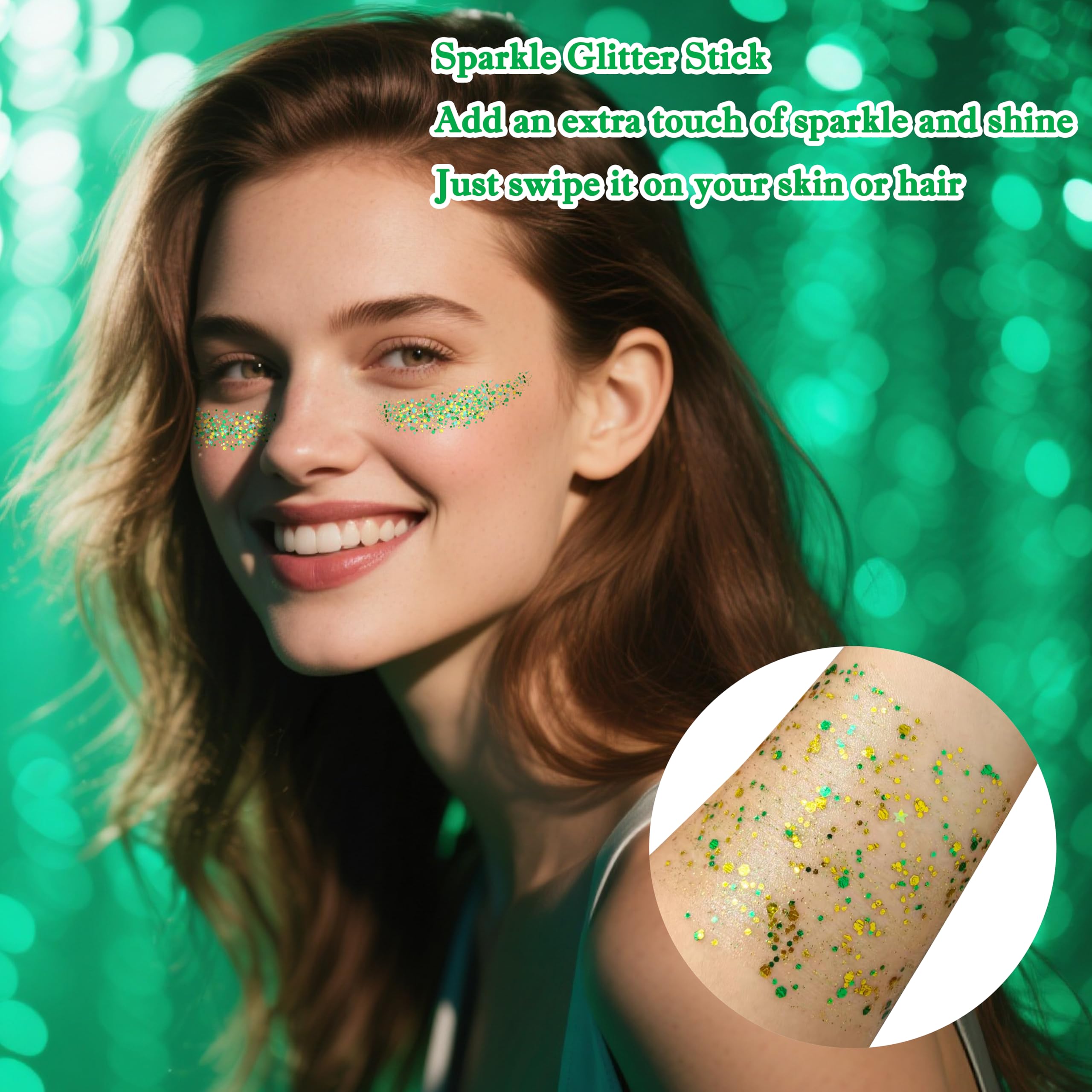 Dazzling Sparkle Effect for Mardi Gras St.Patrick's Day: Our gold and green face glitter stick delivers intense, eye-catching sparkle with different shape of glitter sequins,mixing with little star,round,hexagon glitter sequins,creating a stunning shimmer that enhances your natural beauty for unforgettable events,perfectly aligned with St. Patrick’s Day cheer, Mardi Gras vibrancy, and other lively celebrations.