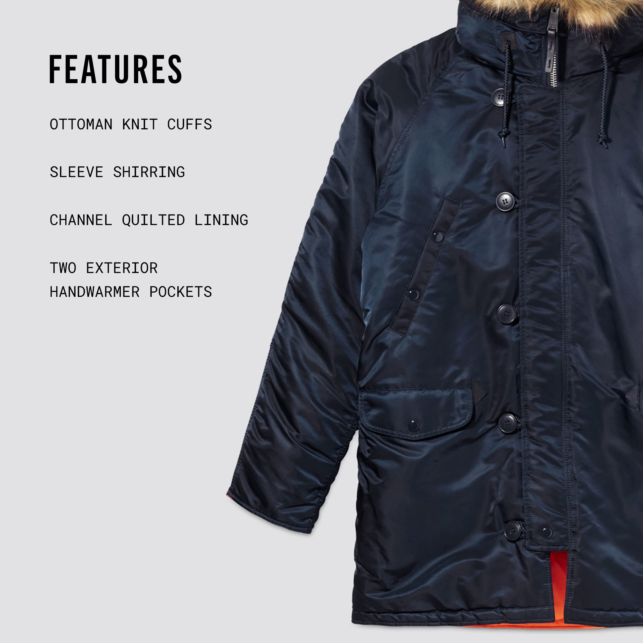 Description Alpha's classic N-3B parka with channel quilted lining for Extreme Cold Weather situations in a contemporary slim fit with contrast lining.