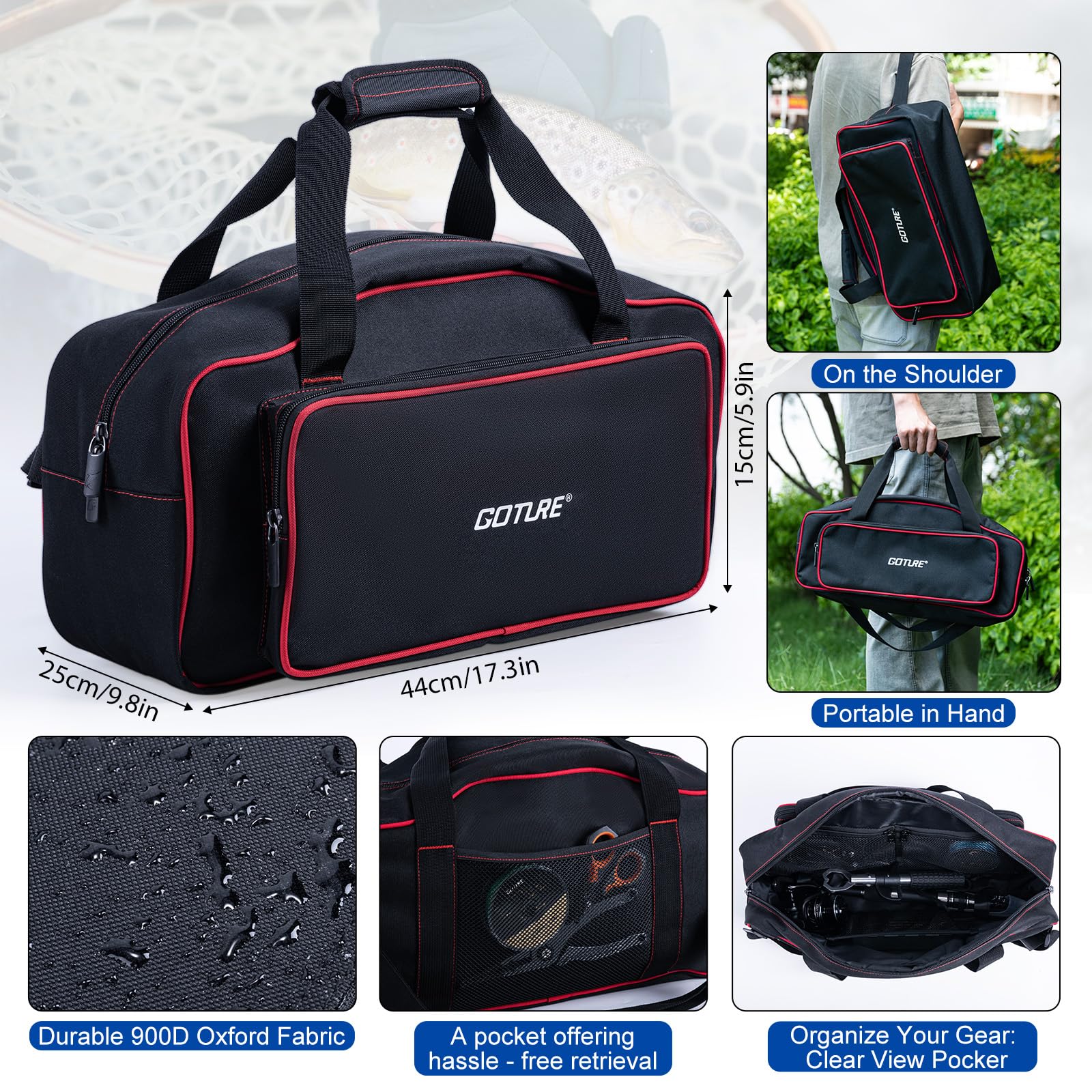 【Oxford Fishing Rod Bag】Crafted from thick, wear-resistant material with a water-resistant surface, this versatile carry bag features both comfortable hand-carry (with padded handle) and an adjustable shoulder strap for easy transport. The interior is intelligently organized with multiple layers, including three mesh pockets, a dedicated rear mesh compartment, and a central Velcro strap to securely hold your rod combo, offering exceptional protection and storage for your entire fishing kit.