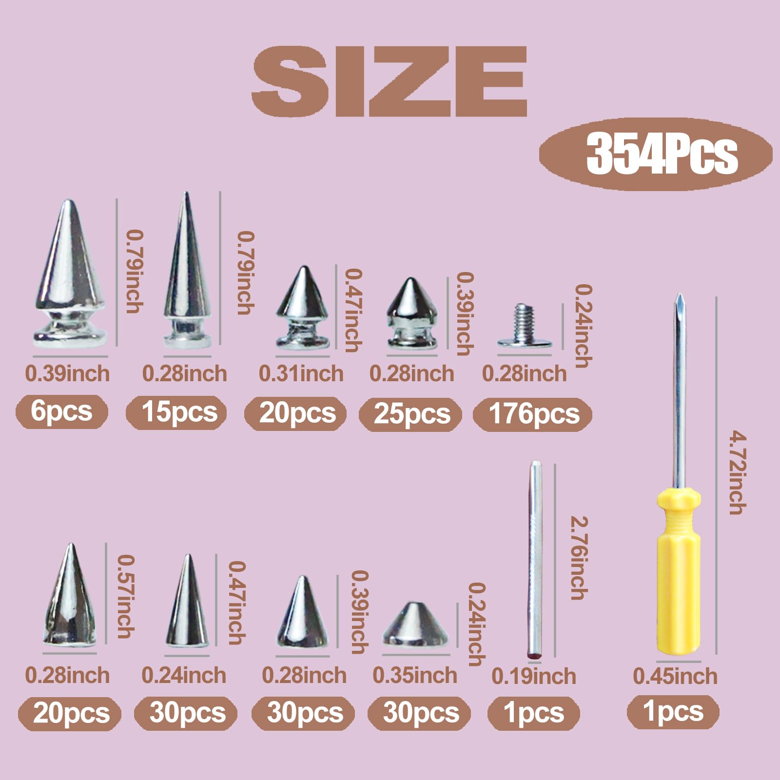 Package Contains:354 Sets cone spikes studs with screws contain 8 different sizes,can be designed according to your needs to create your own unique punk style. 5mm diameter punch and 3mm diameter screwdriver.These tree spikes studs enough to meet your daily application and replacement,Coming with plastic storage box