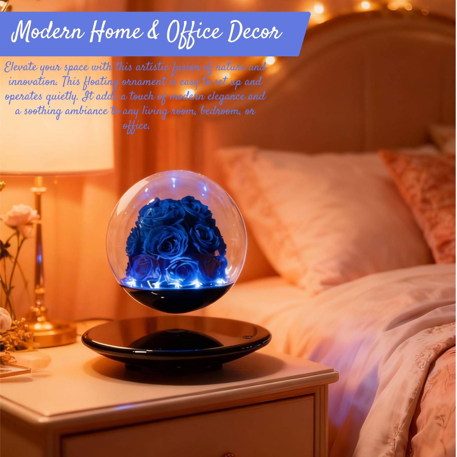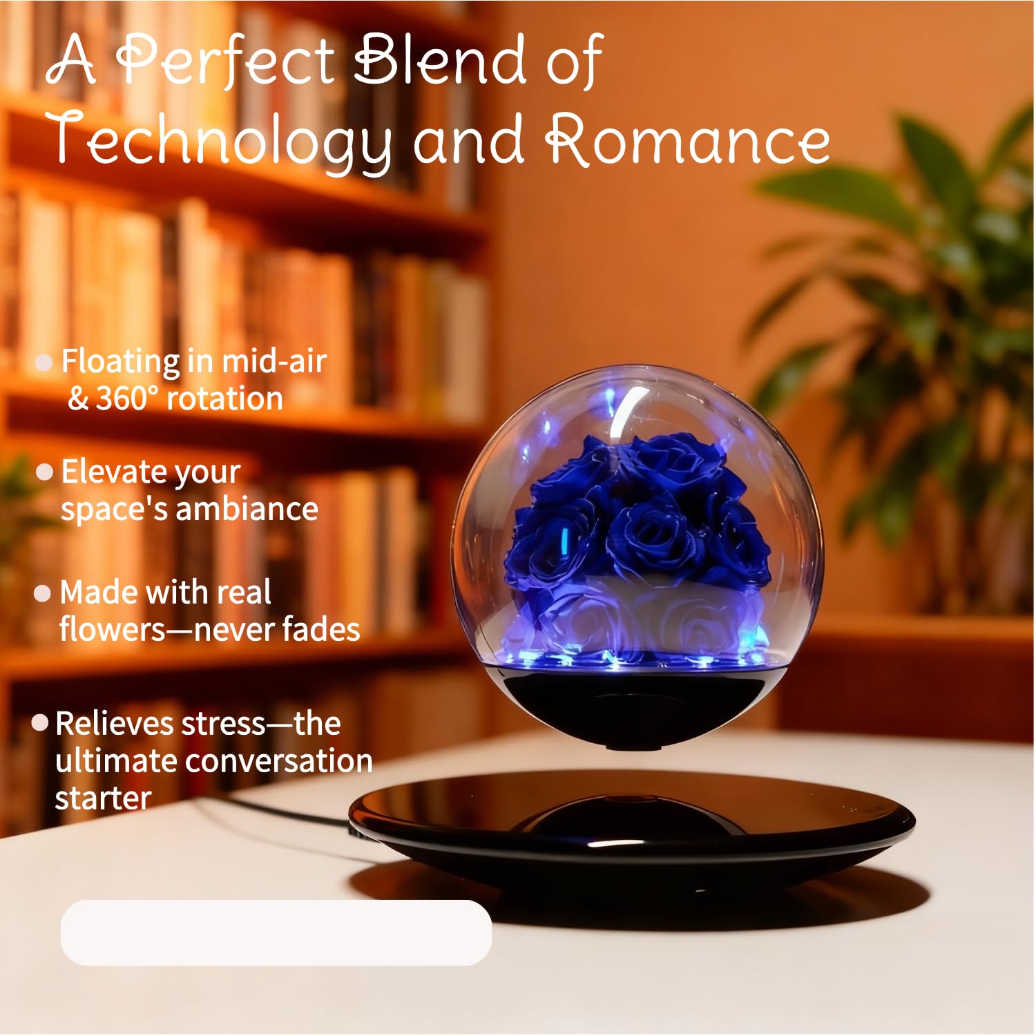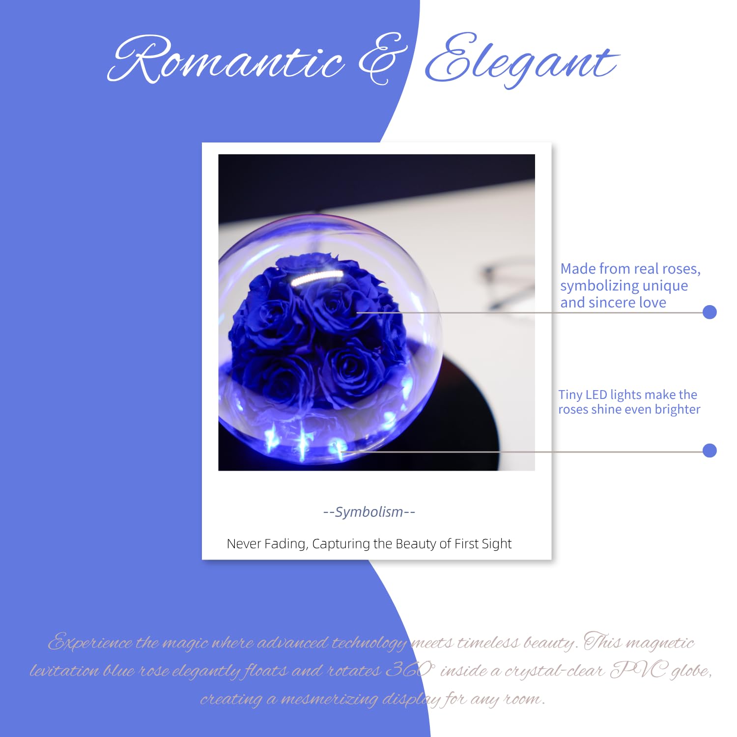 A Perfect Blend of Technology and Romance:Experience the magic where advanced technology meets timeless beauty. This magnetic levitation blue rose elegantly floats and rotates 360° inside a crystal-clear PVC globe, creating a mesmerizing display for any room.