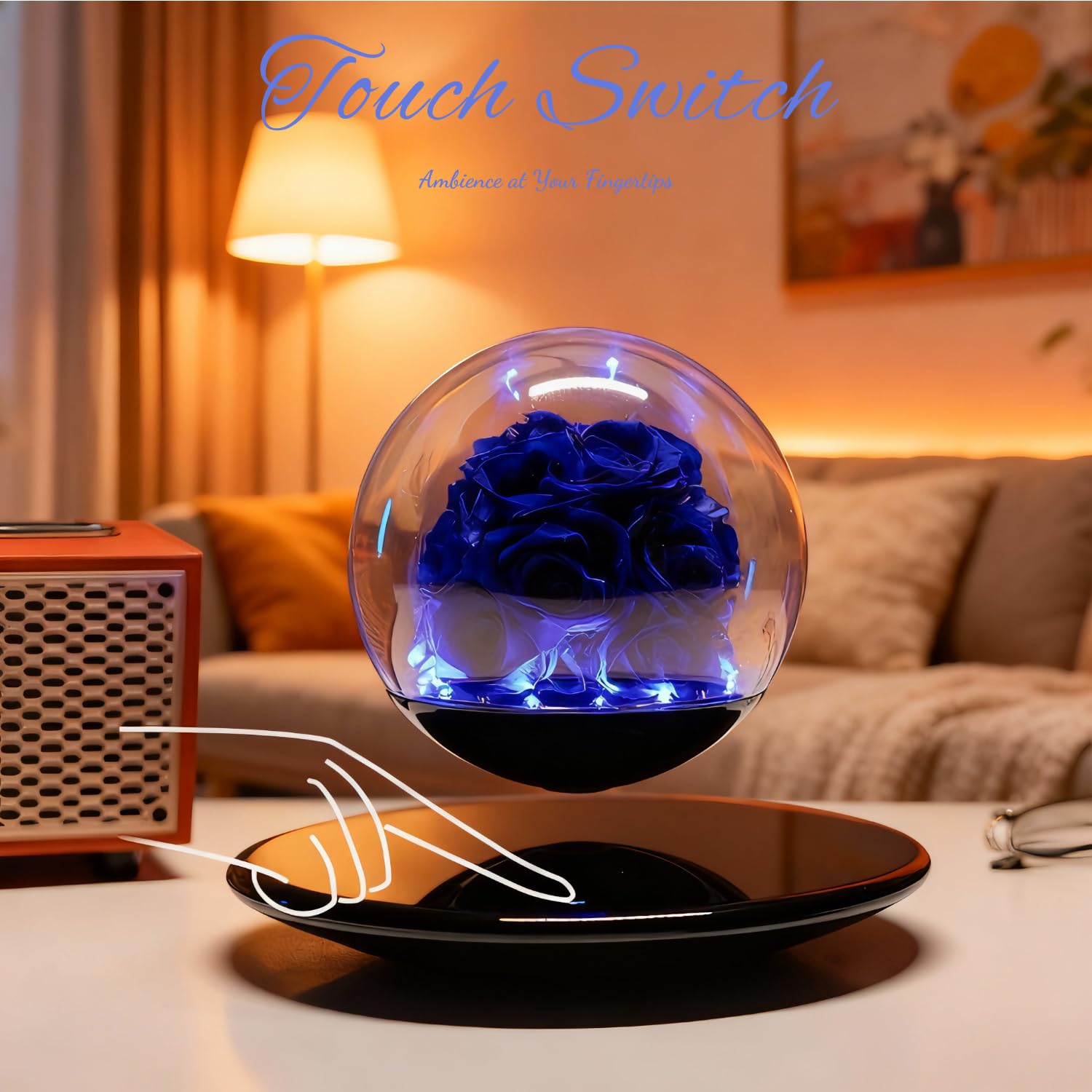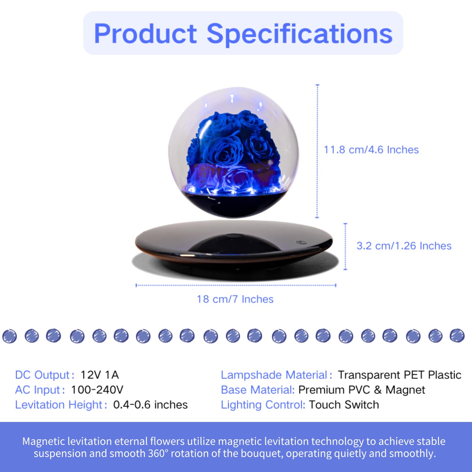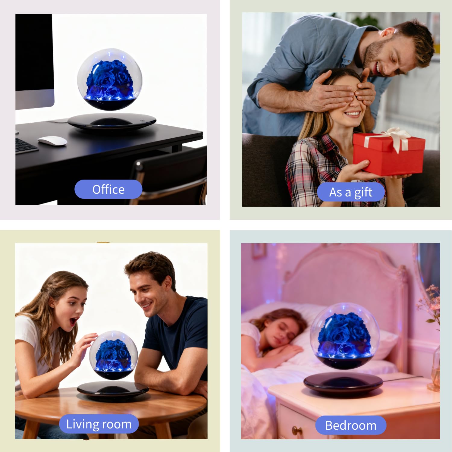 A Perfect Blend of Technology and Romance:Experience the magic where advanced technology meets timeless beauty. This magnetic levitation blue rose elegantly floats and rotates 360° inside a crystal-clear PVC globe, creating a mesmerizing display for any room.