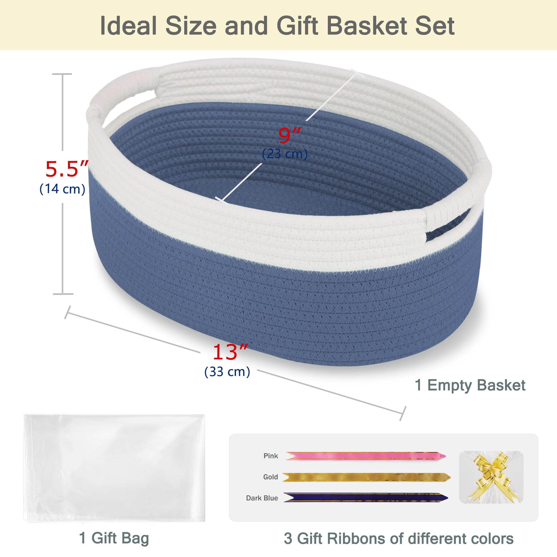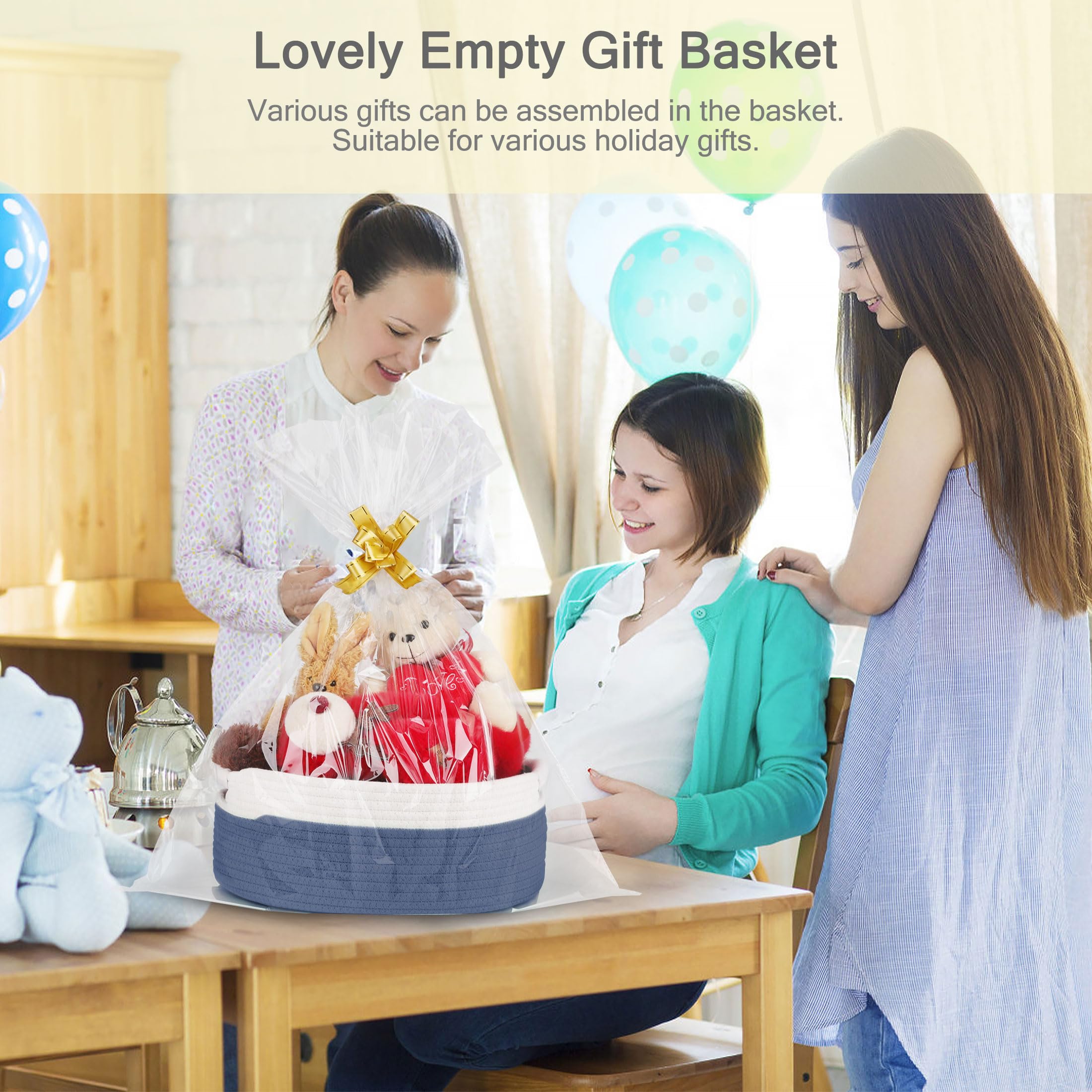 【Ideal Size and Material】Our lovely empty gift basket measures 13“ x 9” x 5.5". It is made of high quality natural cotton rope, soft and skin-friendly, chemical free, and won't scratch clothes or furniture. It's a perfect storage basket for families with babies or pets.