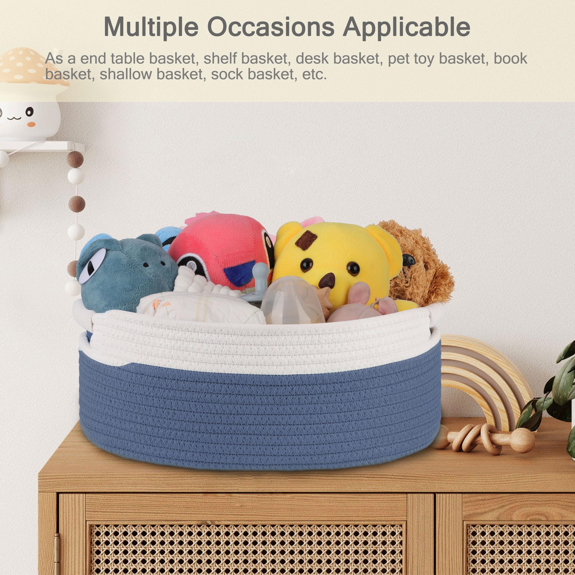 【Multifunctional Storage Basket】 Our rope storage basket is the perfect solution for keys, wallets, diapers, books, remotes, toys, makeups, and more. You can use it as a baby basket, end table basket, shelf storage basket, desk basket, kids' toy basket, book basket, shallow basket, and more. It can even be used as a pet toy basket for cats and dogs.