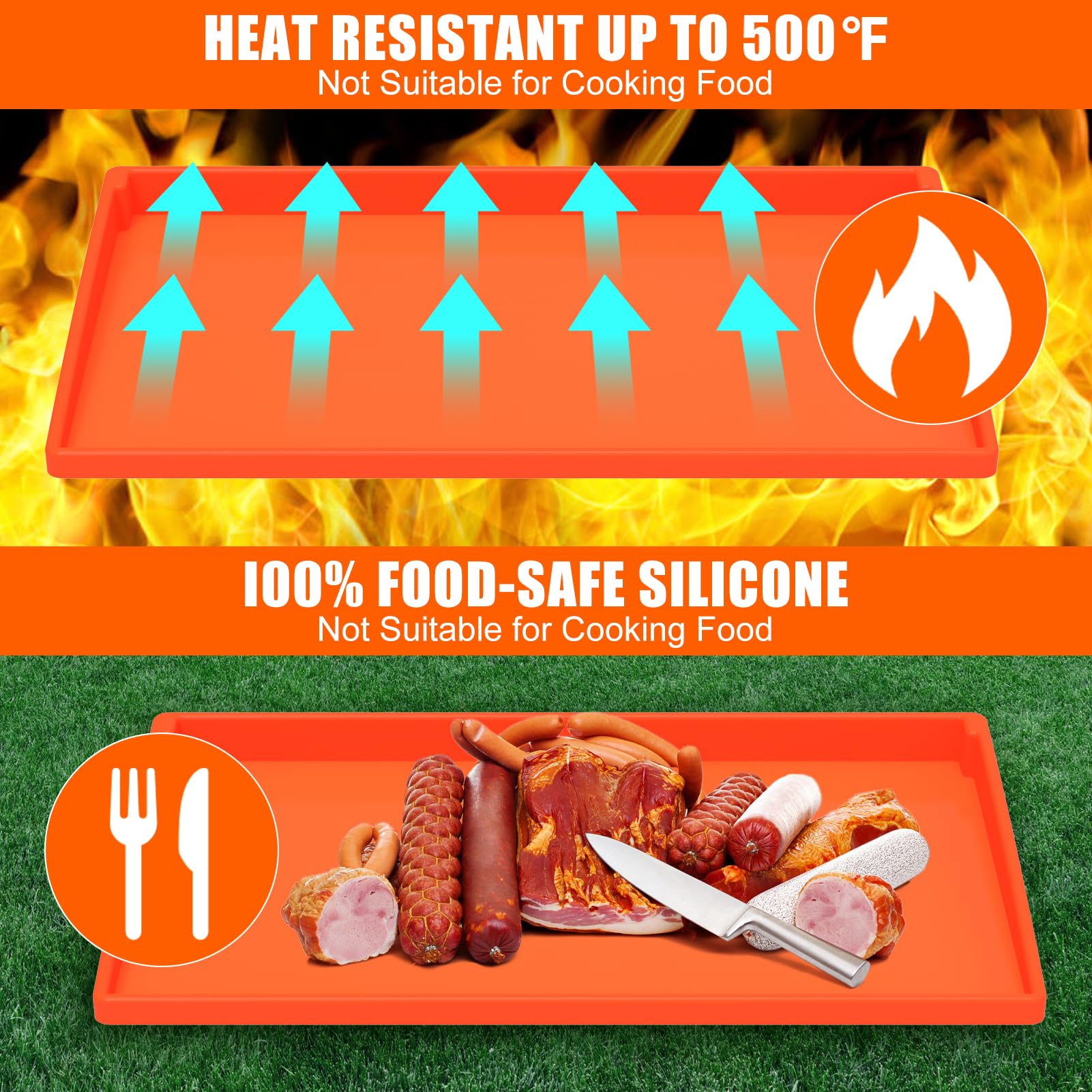 【FOOD GRADE SILICONE】: The griddle mat for blackstone grill is made of 100% high-quality food-grade silicone, thick, durable, soft, safe and reliable, you can use it with confidence, it will not heat or transfer heat, and can withstand up to 500℉.
