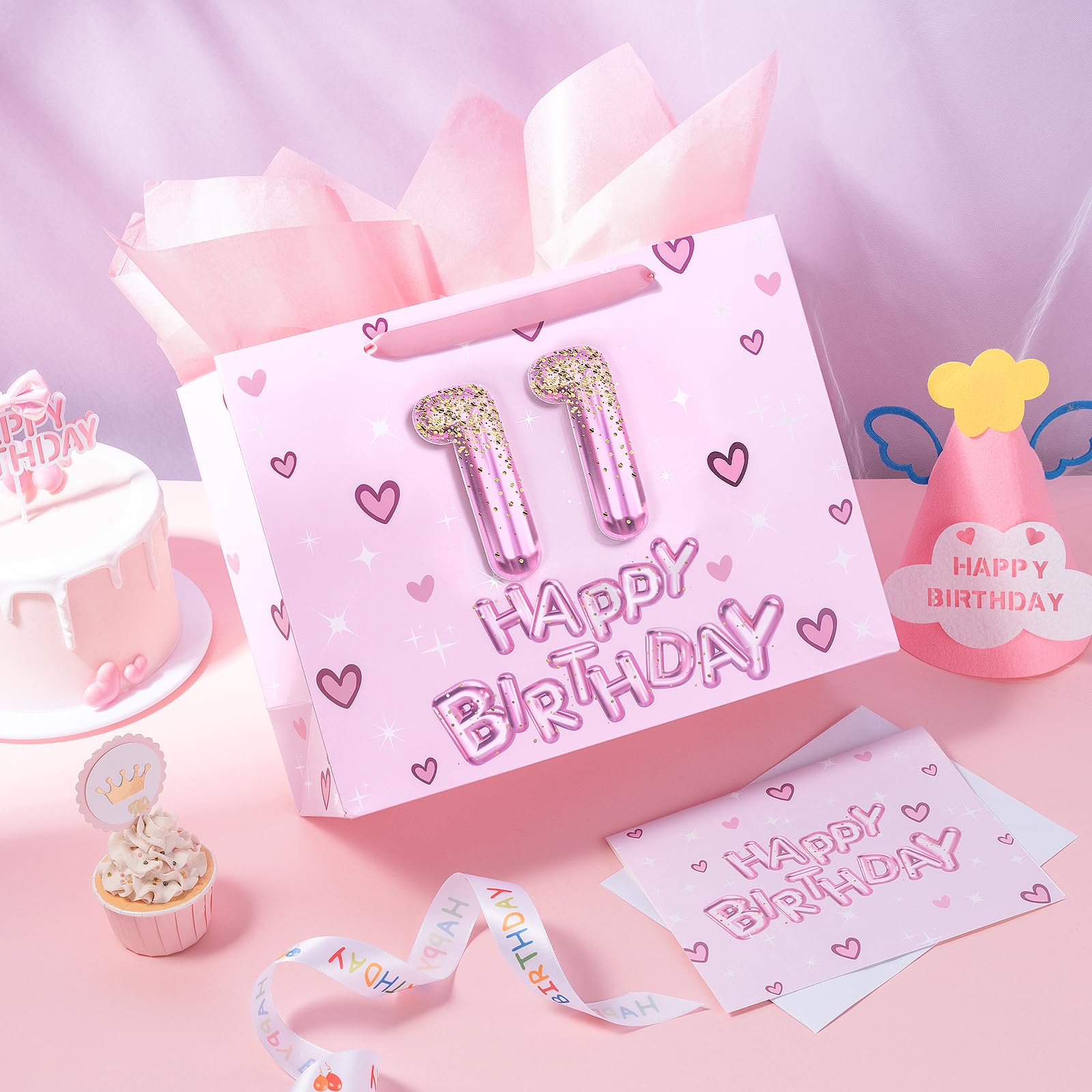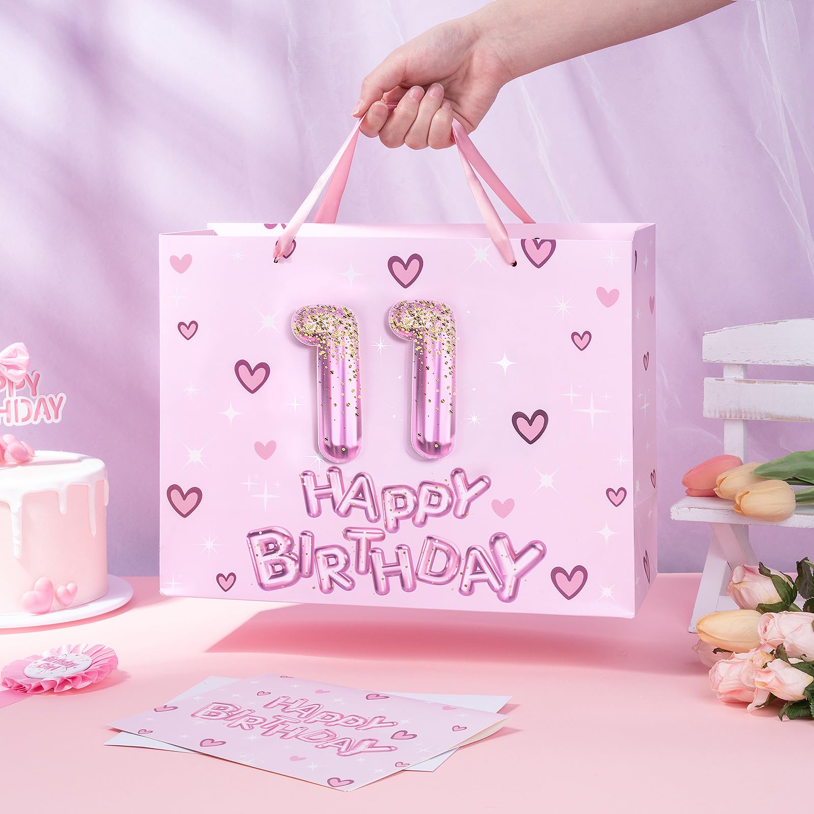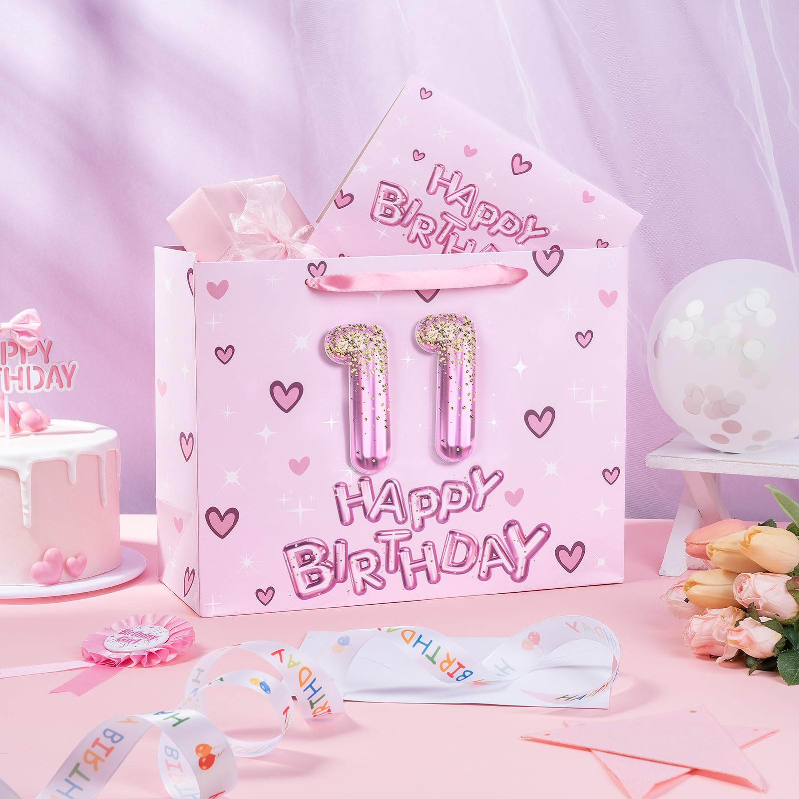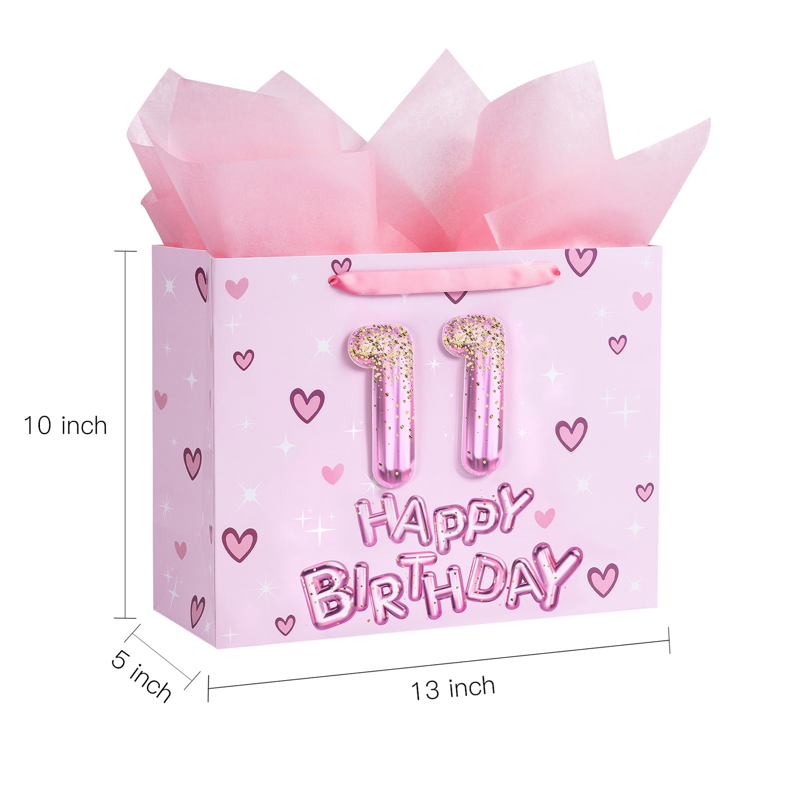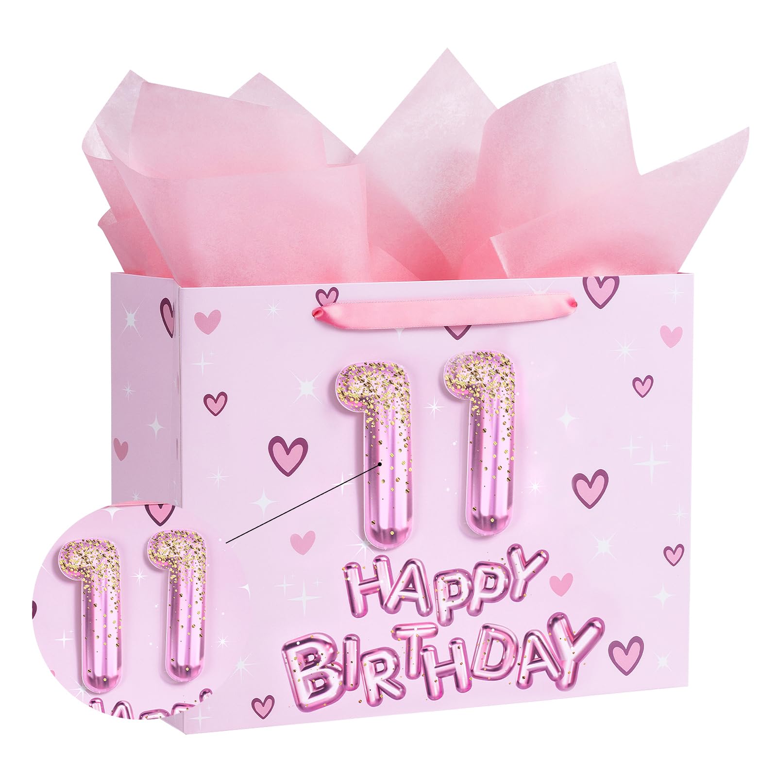 Sparkling Birthday Design: The gift bag features vibrant 3D number 11 balloon letters in shades of pink, sparkling with glitter effects. This fun design is enhanced by cute hearts and stars, creating a joyful and celebratory atmosphere perfect for any birthday occasion