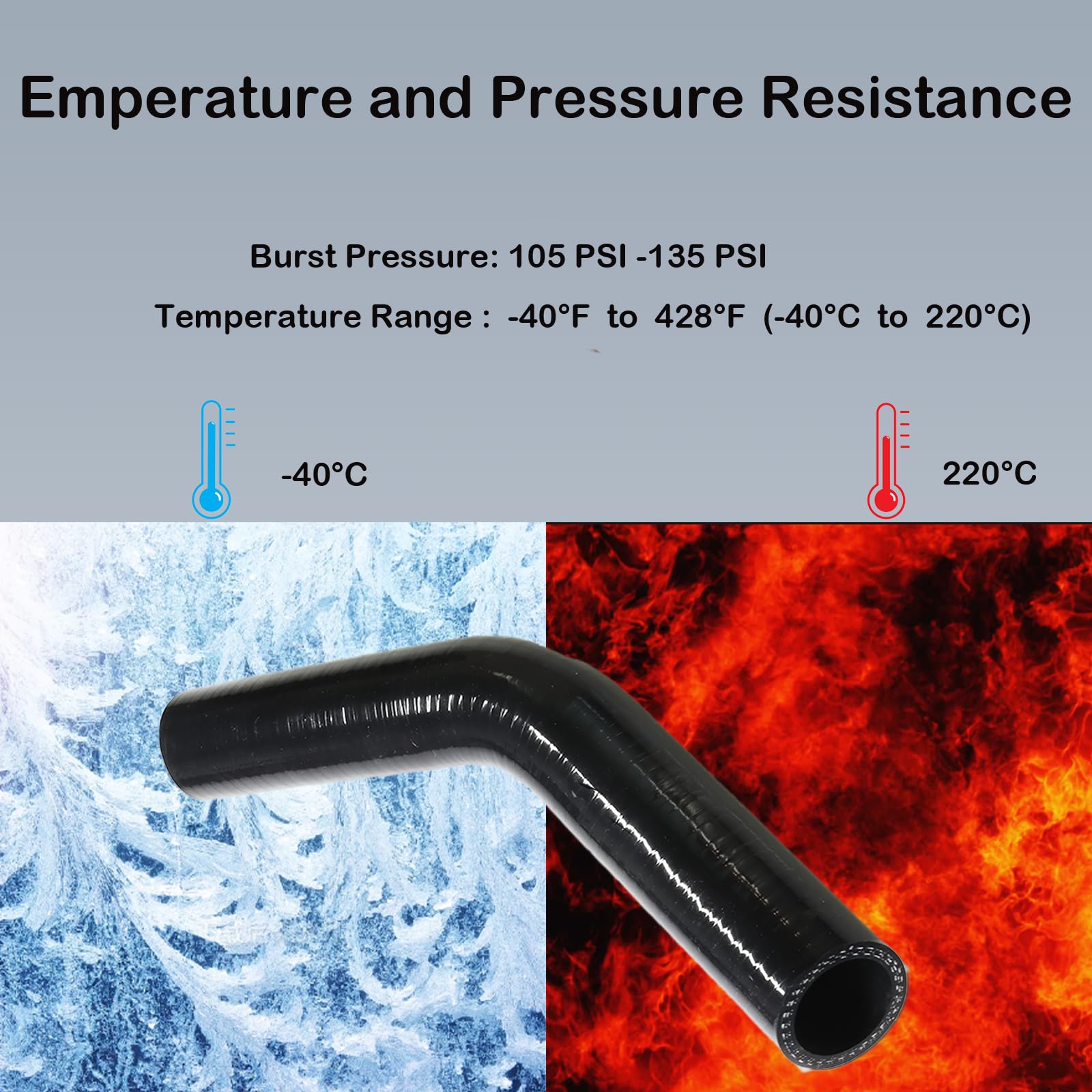 【Emperature and Pressure Resistance】45 degree elbow silicone hose is operates effectively within a temperature range of -40°F to 428°F (-40°C to 220°C)and supports 130PSI at room temperature for superior safety, making it ideal for extreme weather and industrial applications.