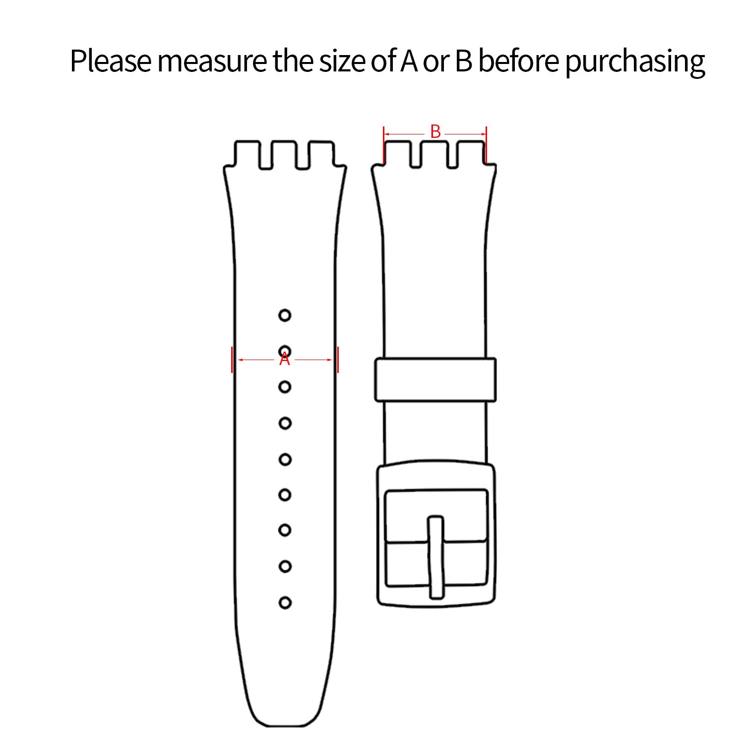 Compatible with swatch 16mm 17mm 19mm straps, also compatible with other brands 17mm, 19mm straps. Measure the width from one side of the buckle to the other. Note that many straps are tapered and narrower at the end where the buckle is connected than at the end where the watch is connected