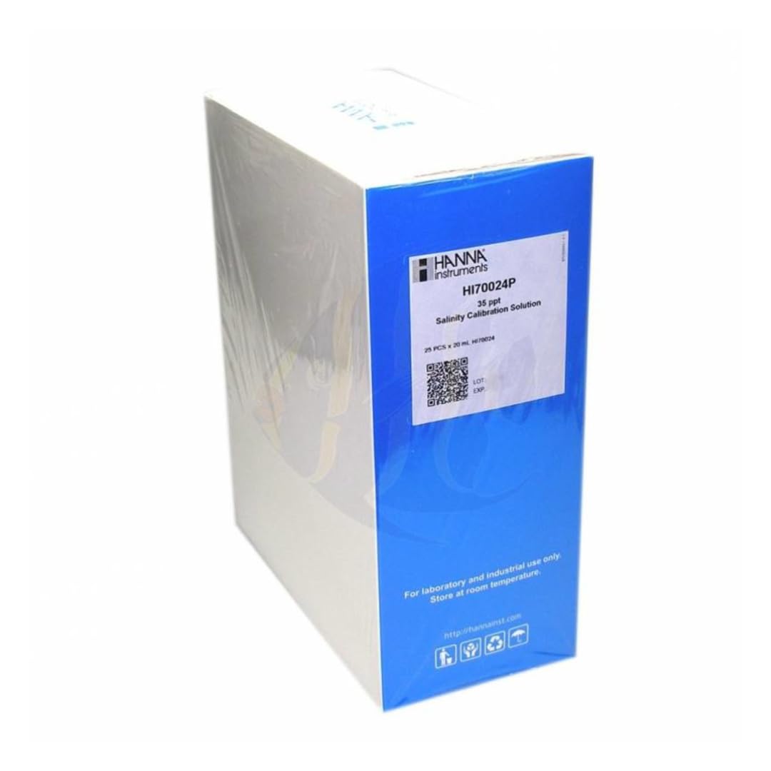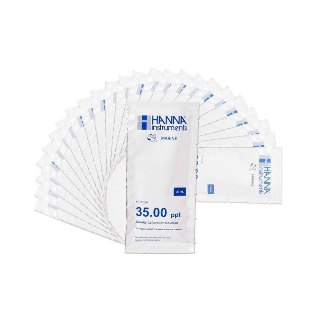 HI70024P is a premium quality 35.00 ppt salinity calibration solution that is NIST traceable and contained in portable single-use sachets. Each sachet has the lot number and expiration date stamped on it and is made of light block foil ensuring freshness each time one is opened. Hanna's line of calibration solutions have been specially formulated to have an expiration of 5 years from the date of manufacture for an unopened sachet. The HI70024P is for 25 sachets containing 20 mL of solution.