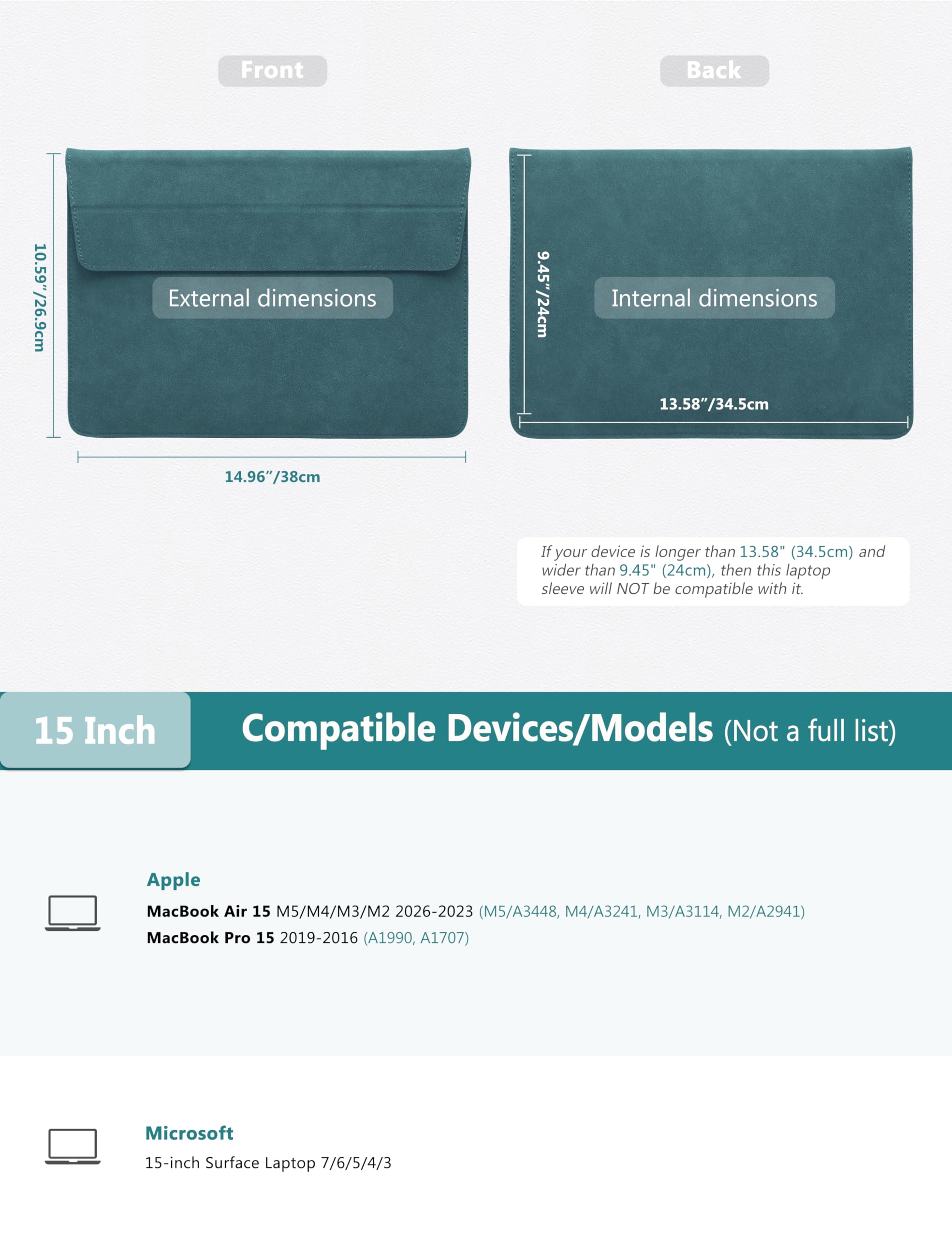 Internal Dimensions: 13.58" x 9.45" (34.5 cm x 24 cm). NOTE: Please read the list of compatible devices carefully before purchasing. It is perfectly compatible with 2026 2025 2024 2023 New MacBook Air 15 with M5 M4 M3 M2 Chip (Model: A3448, A3241 A3114, A2941), MacBook Pro 15 2016-2019 (Model: A1990, A1707). Also compatible with 15-inch Microsoft Surface Laptop 7/6/5/4/3, etc.