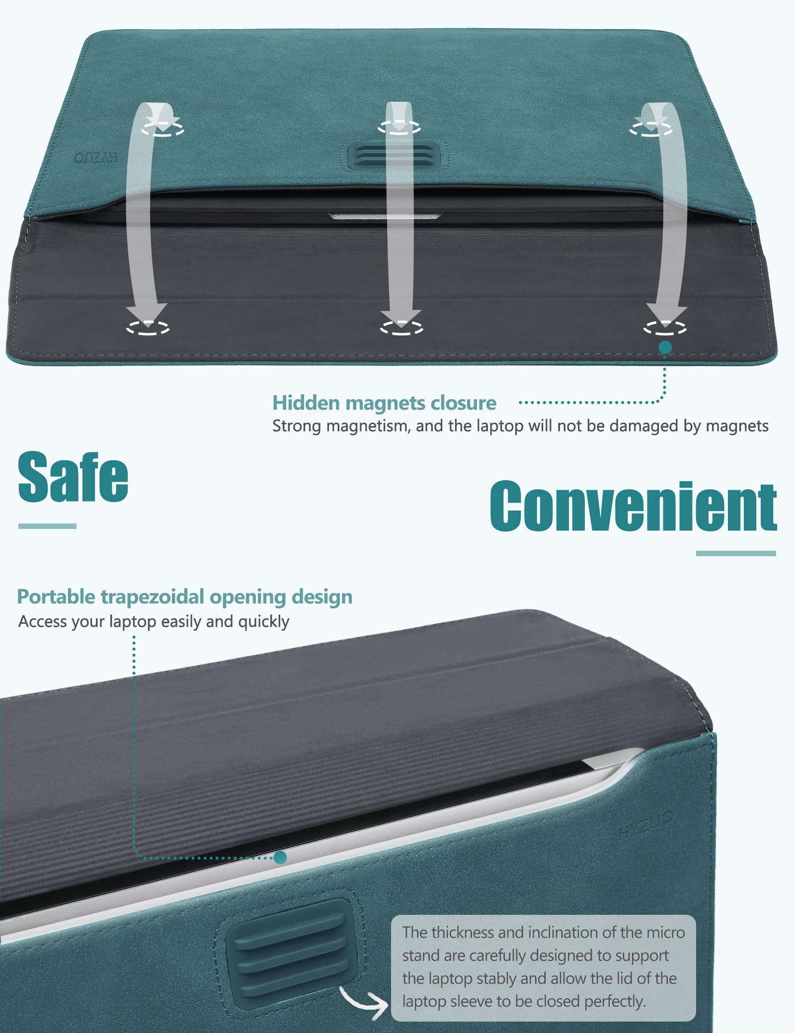 Innovative Tri-fold Stand: Original design laptop sleeve with a miniature stand that can be adjusted to 3 angles, allowing you to adjust to a healthy sitting posture and a scientific viewing angle, relieving the pressure on the cervical spine while facilitating laptop cooling. The stand is made of TPU material with high strength and aging resistance. Its thickness and tilt angle are carefully designed to support the laptop stably while enabling the lid of the laptop sleeve to be closed perfectly