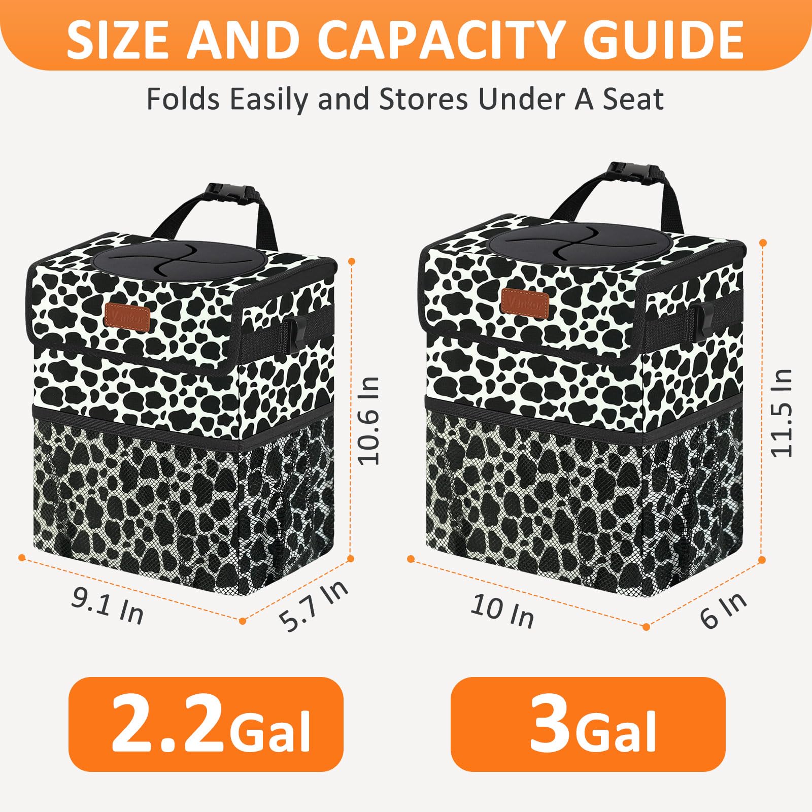 Intimate Design& Capacity: There are 2 side clasps for fixing disposable bags, effectively preventing falling out; Vankor car trash bags have about 2.2 and 3.0 Gallons for storage of car garbage or other stuff; Car trash bin has 100% leak-proof PEVA thick lining, no spillages will happen and is easy to be cleaned; The extra-large opening is made of elastic soft rubber, very roomy and easier to put litter into the bag, and helps to keep trash from spilling