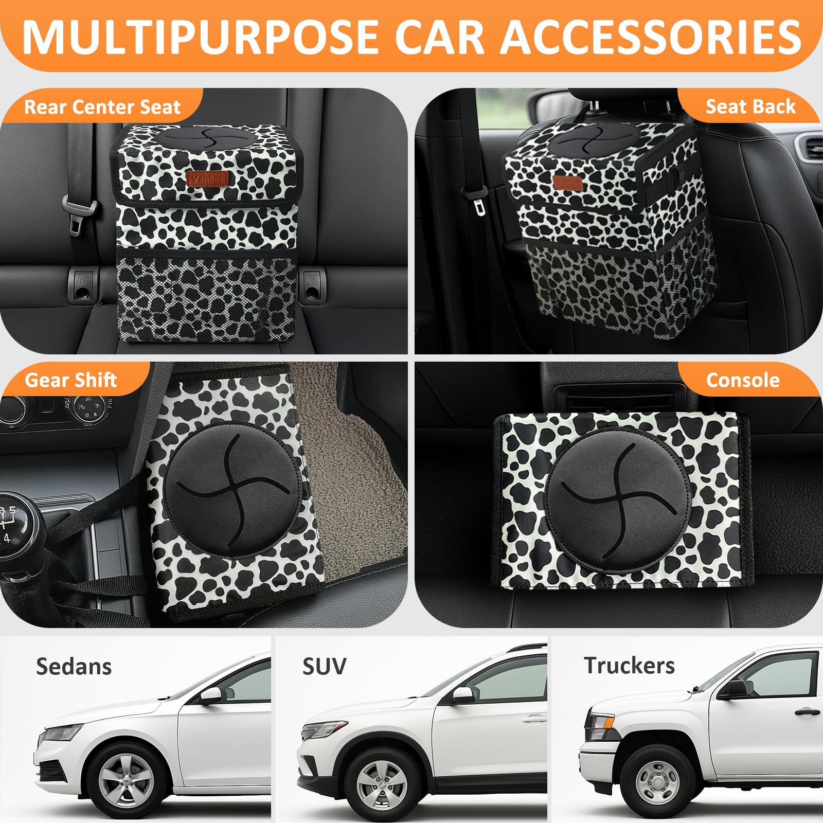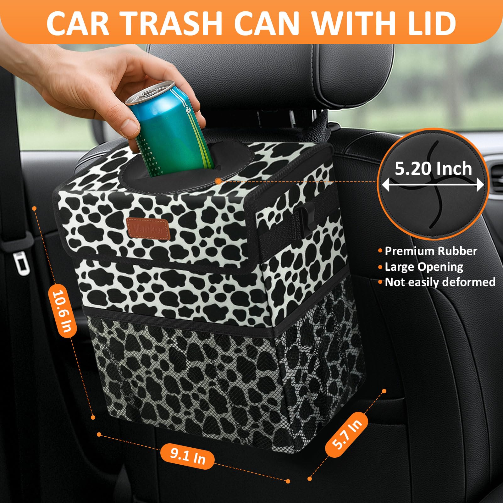 Keep Your Car Clean: Are you always bothered by the messy of the car interior; Vankor's car trash can with lid will help you to solve this annoyance; This cute car trash can will be helpful for keeping your car clutter-free, ensuring you are in a good mood while driving; Large car trash can with an adjustable strap is hung on the gear shift, glove box, headrest; You can also display the hanging car trash bag on the floor, hanging on the back seat, co-driver seat, or any place in your car