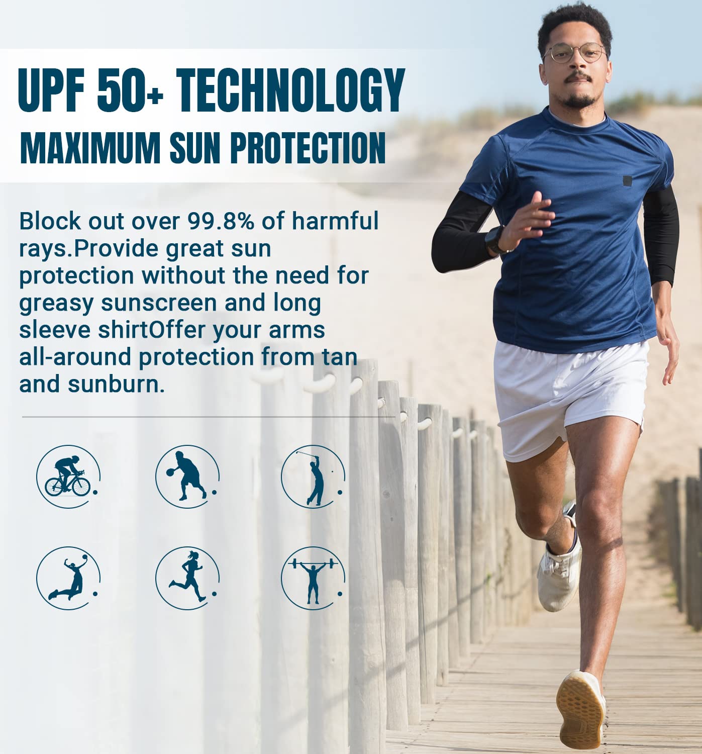 All-Round Sun Protection - UPF 50+ protective technology works great to keep the harmful sun rays off your skin when golfing, shooting, running, bike riding, etc. No need for greasy sunscreen or long sleeves shirts. These uv sun protection arm sleeves shield your arms from sunburn and skin damage during long days in sun.
