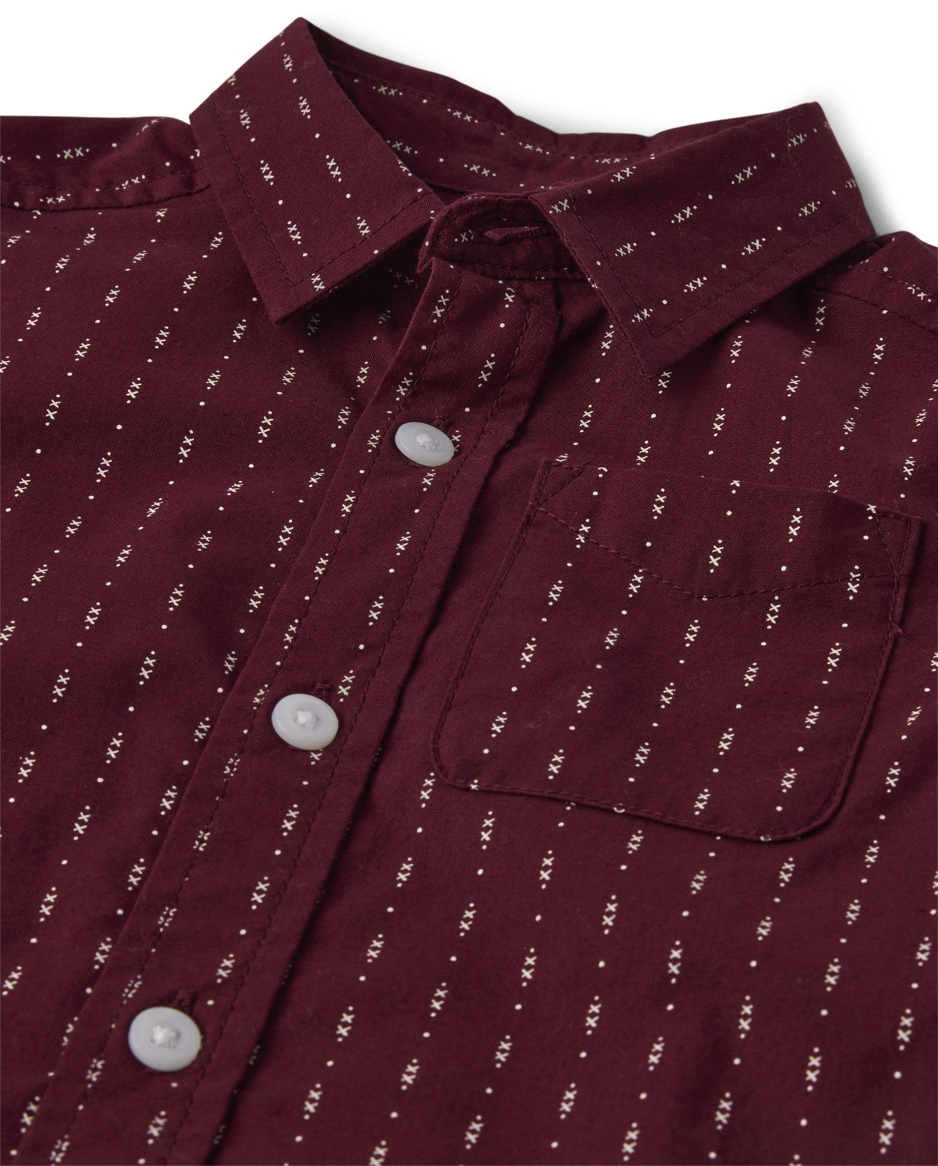 DESIGN — Features long sleeves with button cuffs, pointed collar, chest pocket, curved shirttail hem and allover dot print