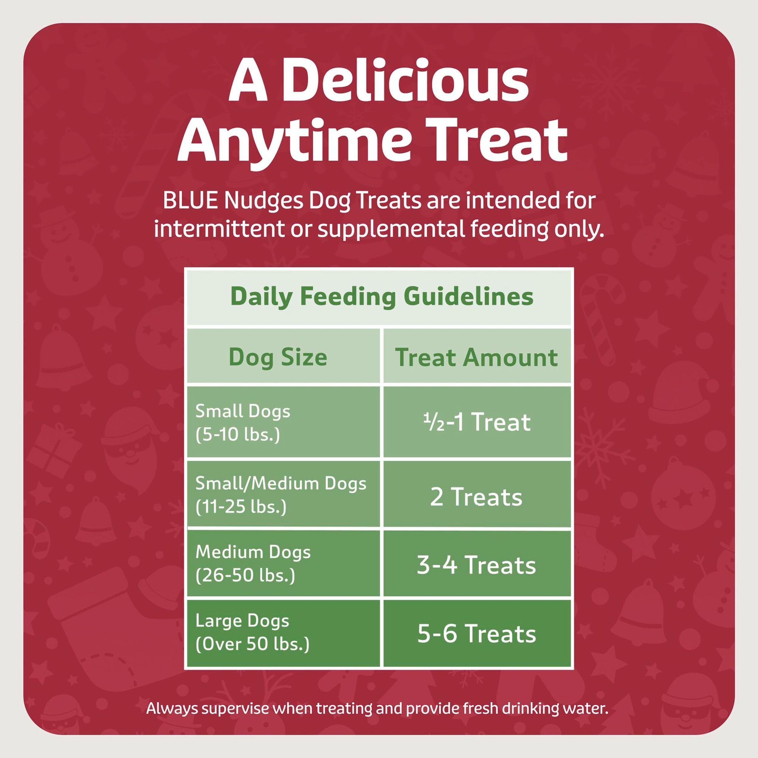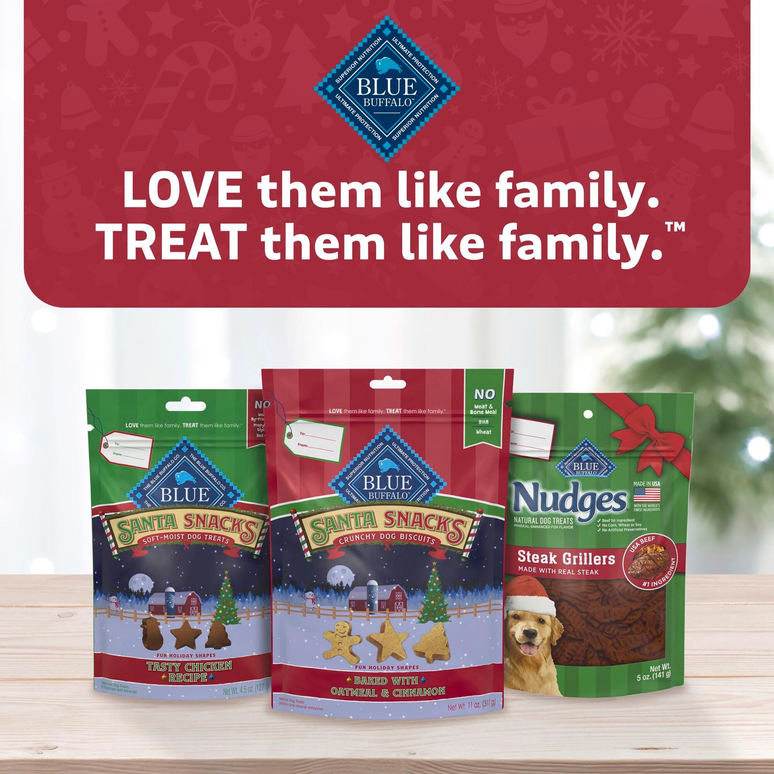 Give your best buddy the best gift this holiday season with BLUE Nudges Steak Grillers. These deliciously festive treats make the perfect stocking stuffer for dogs who are always on the nice list. This tasty steak recipe is perfect for snuggling by the fire, but these meaty treats are great for any occasion! They are inspired by grilled favorites and feature a flavor and texture dogs love. BLUE Nudges are made with wholesome, real ingredients starting with USA beef. They contain no chicken (or poultry) by-product meals, no corn, wheat, or soy, and no artificial flavors or preservatives, so you and your pup can celebrate joyfully. BLUE Nudges holiday dog treats are available for a limited time only, so grab them while you can! BLUE Nudges are intended for intermittent or supplemental feeding only. They are brought to you by Blue Buffalo, the leader in natural pet food. LOVE them like family. TREAT them like family.