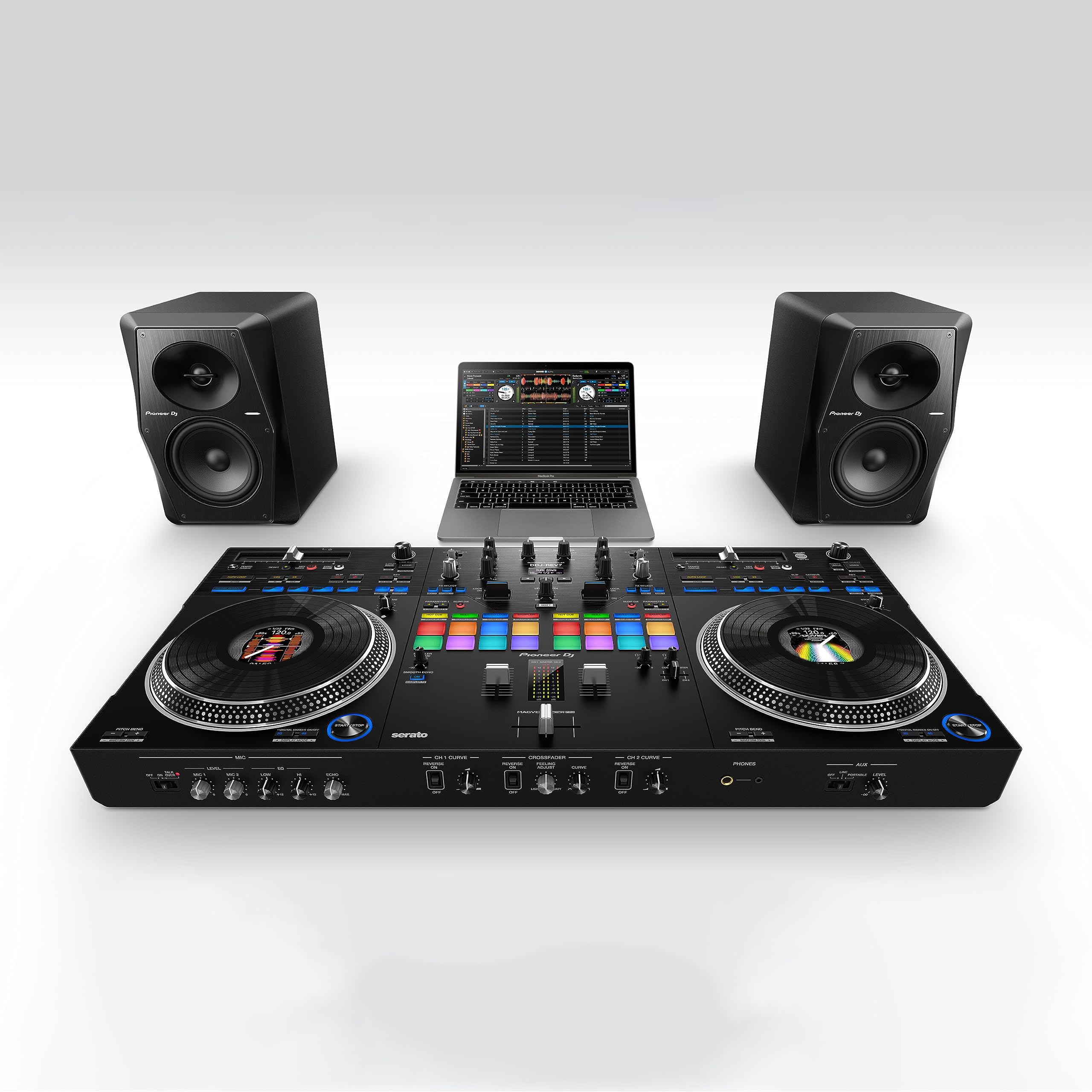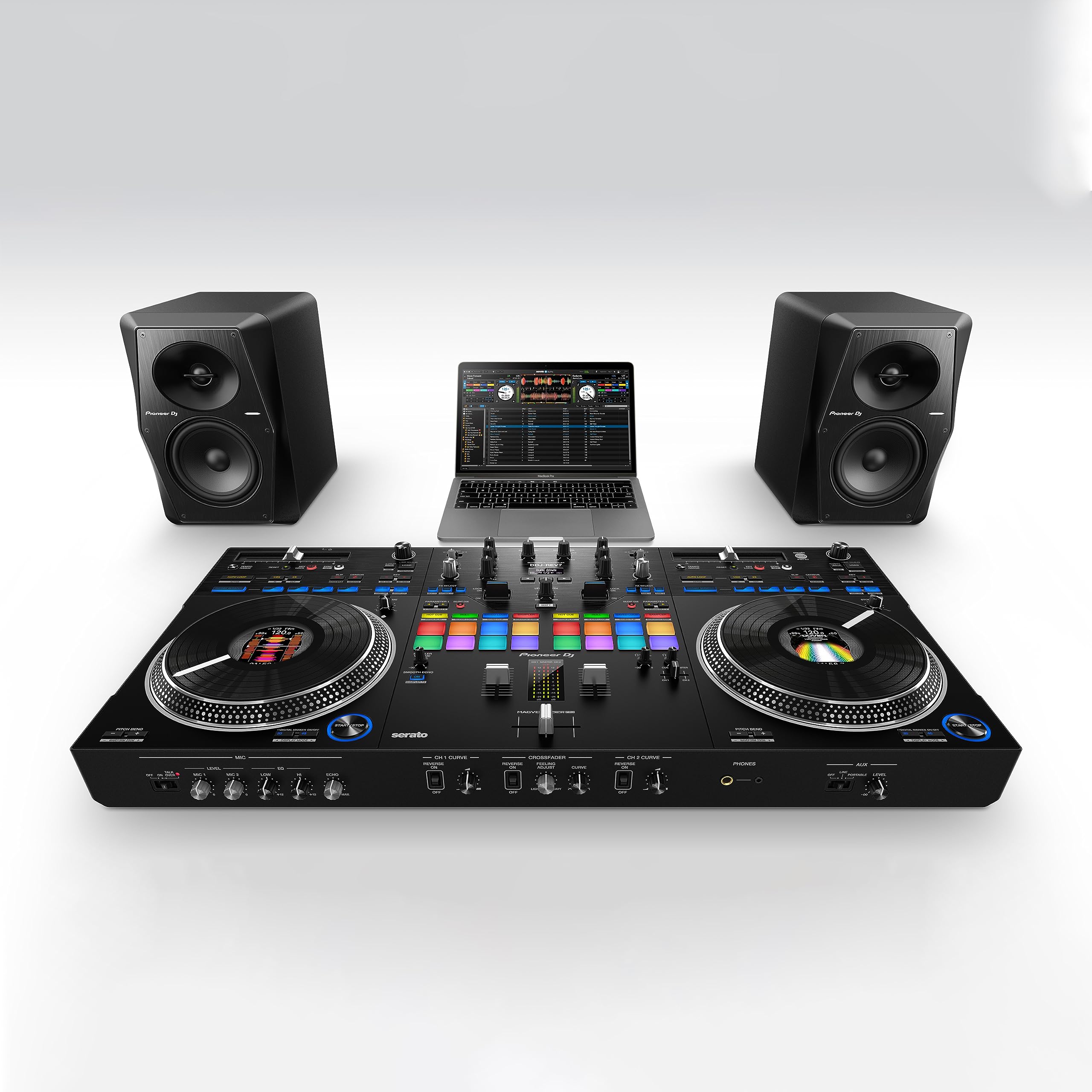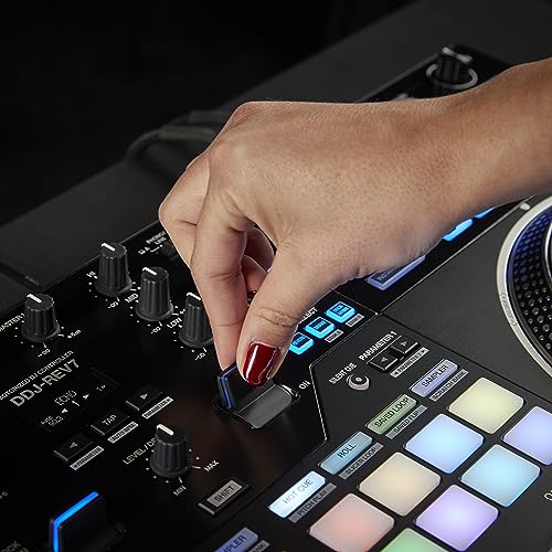 The DDJ-REV7 is built to help you get the most from the Serato DJ Pro performance software and boasts a brand-new design that includes large, motorized jog wheels with On Jog Display to create a tactile connection between you and your music. The layout of this 2-channel unit emulates a professional DJM-S mixer + PLX turntable setup, and includes specialized features for open-format and scratch DJs.