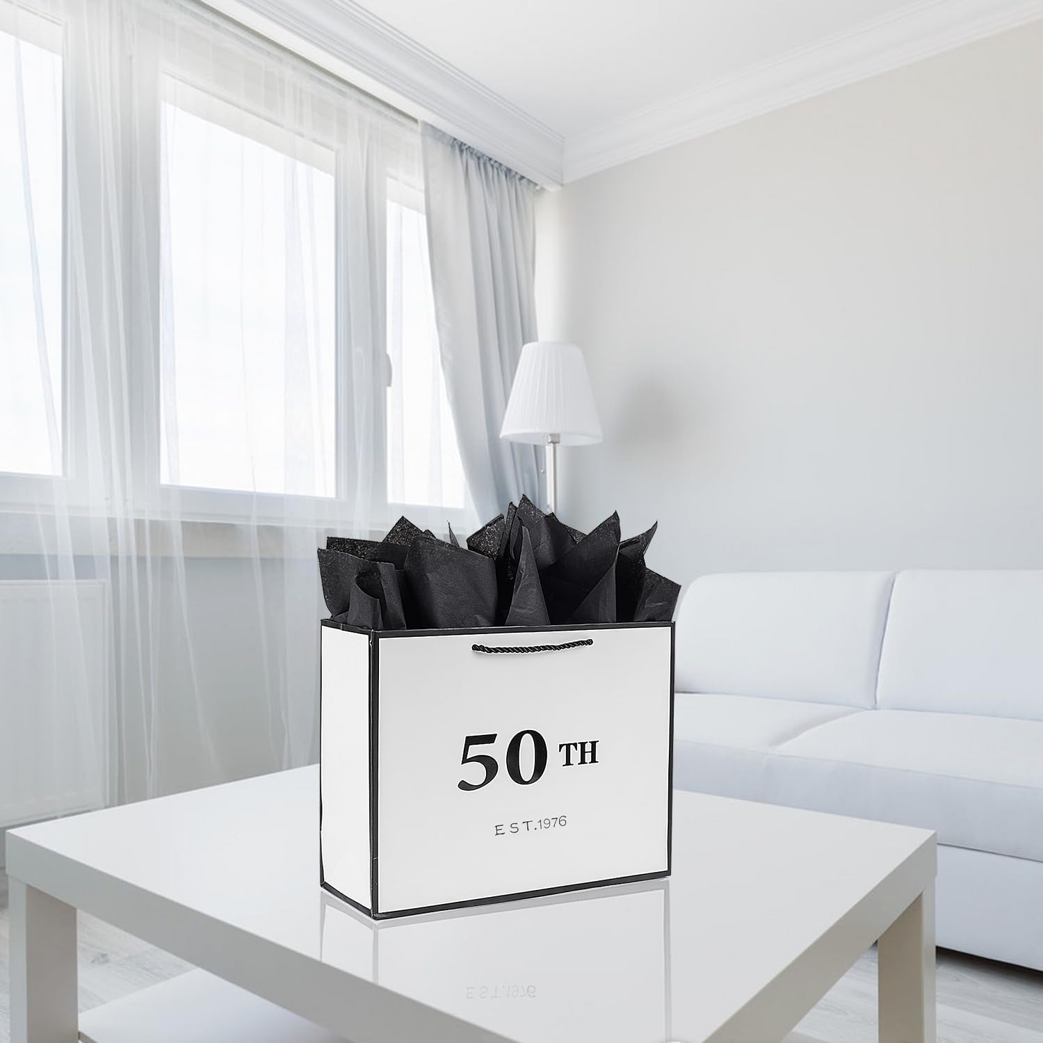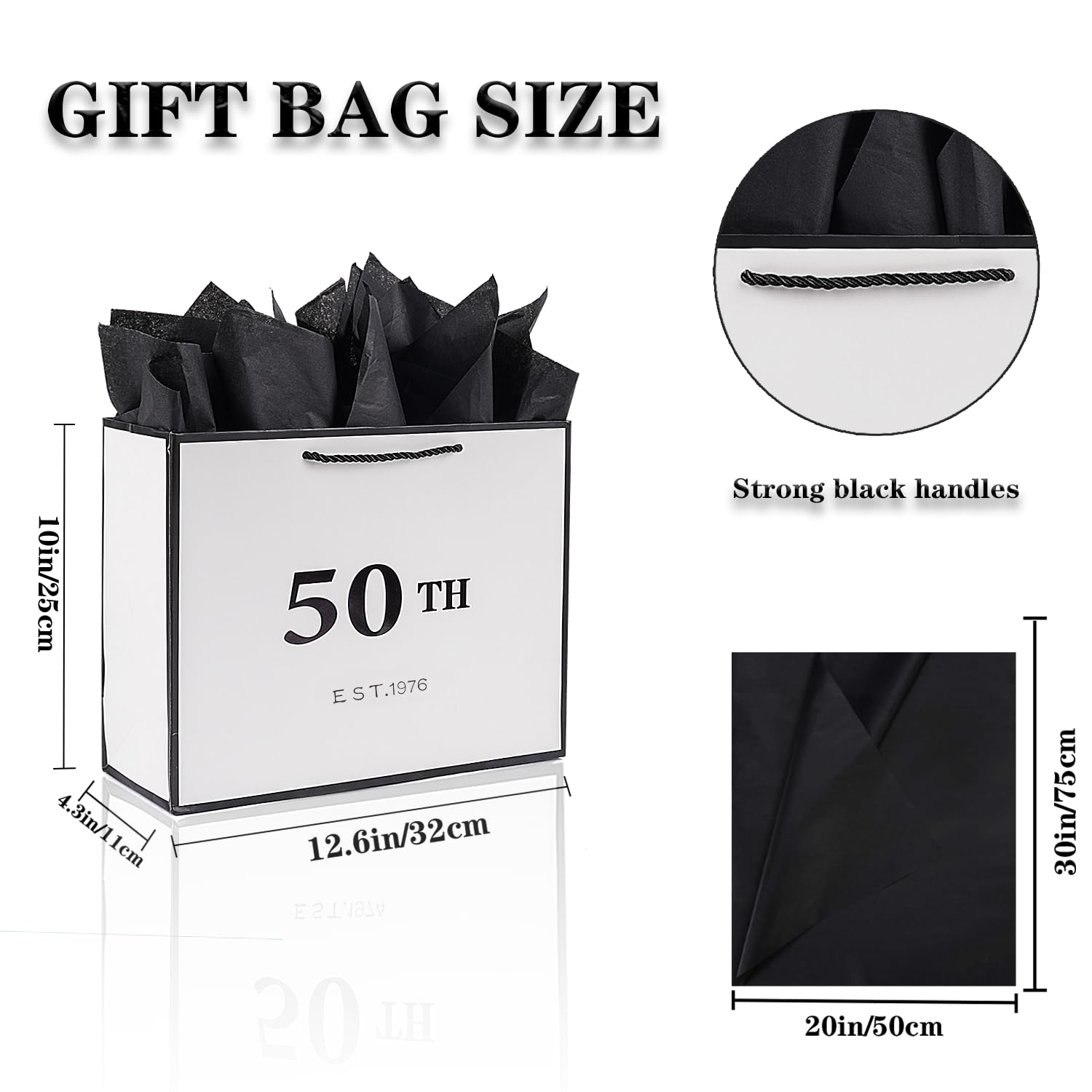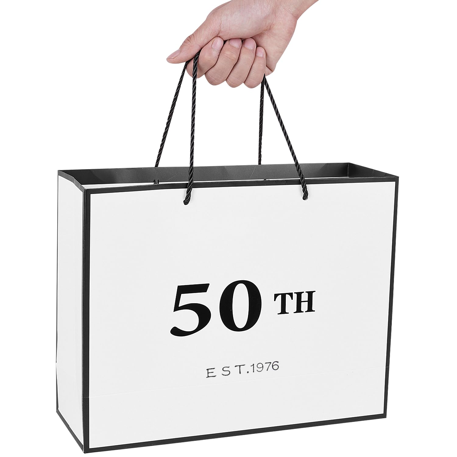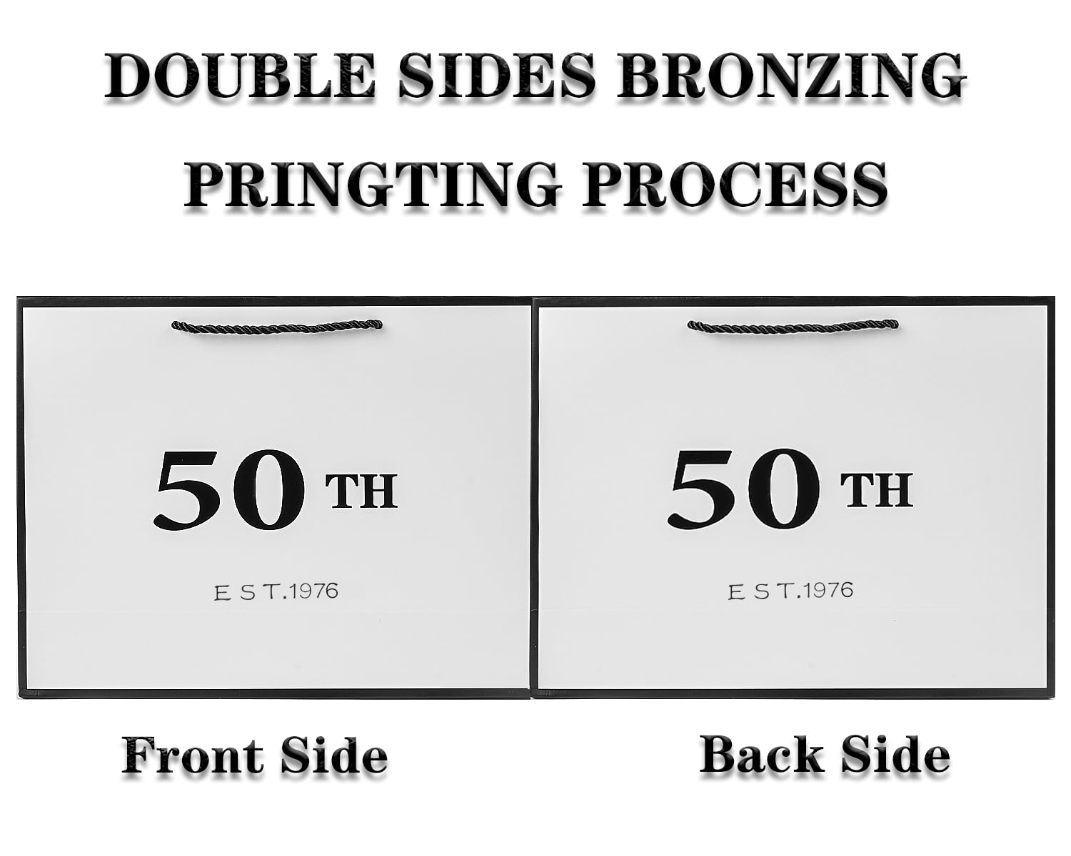 Metallic Printing Design: Our birthday gift bag features black metallic "50TH EST 1976" lettering which are prints on both sides of the bag.