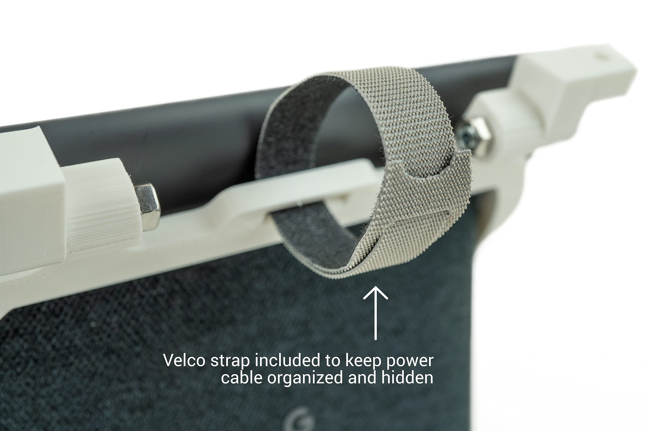 If you want to keep your kitchen organized and counters clear, while ensuring you still have easy access to your Nest Hub Home, this mount is exactly what you need. Simply screw this mount in to the underside of your cabinets and slip the Google Nest Hub Home into the mount - gravity will hold the unit in place at the proper angle for easy eye-level viewing. Also included is a velcro cable wrap so you can bundle the extra power cable and hide it from sight (color of velcro strap may vary based on availability). Volume buttons are accessible while the unit is mounted. This item is 3D printed from high-quality PLA plastic for strength and durability. Google Nest Hub Under Cabinet Hanger Bracket design by piercetis, licensed under the Creative Commons - Attribution license (https://www.thingiverse.com/thing:3307653).