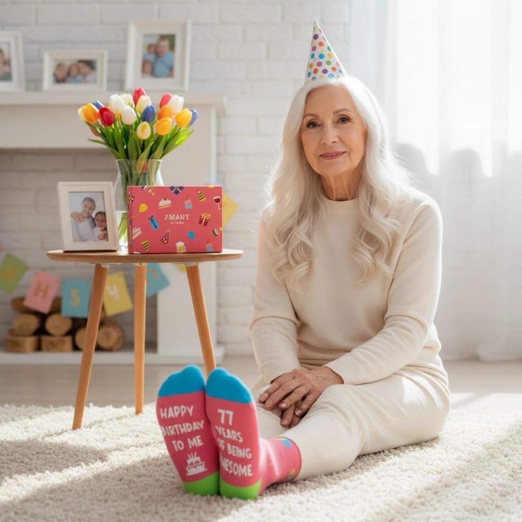 SIZE & PACKAGE: 77 year old gifts for women and men. Our unisex design fits most men's US size 6-13 feet and most women's US size 7 and up. Each exclusive gift box contains one pair of novelty socks.