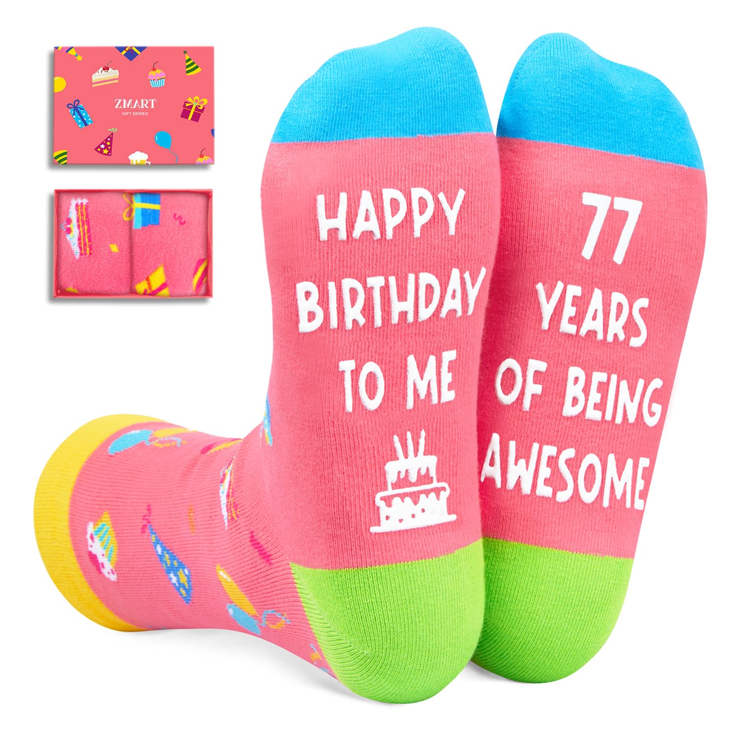77th BIRTHDAY GIFTS: Socks with birthday elements and non-slip secret message: "HAPPY BIRTHDAY TO ME, 77 YEARS OF BEING AWESOME" suitable for birthdays Christmas White Elephant and Mothers Day.