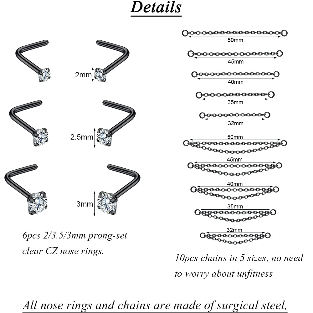 ✿[Package and Size]: Package includes 3pairs nose ring with 2mm 2.5mm 3mm cubic zircon, 10pcs chains in 32mm 35mm 40mm 45mm 50mm. All nose rings in 20 gauge (0.8mm).