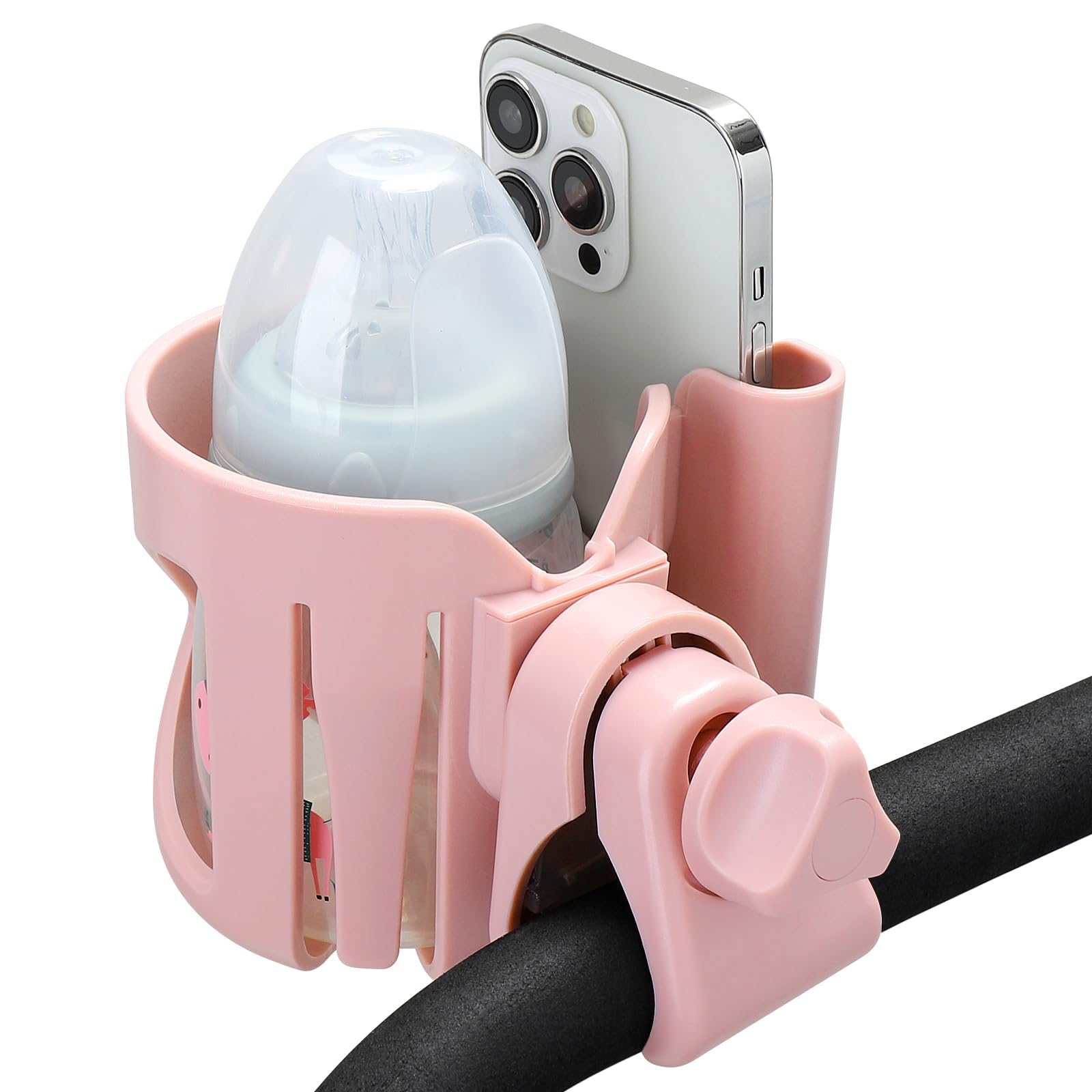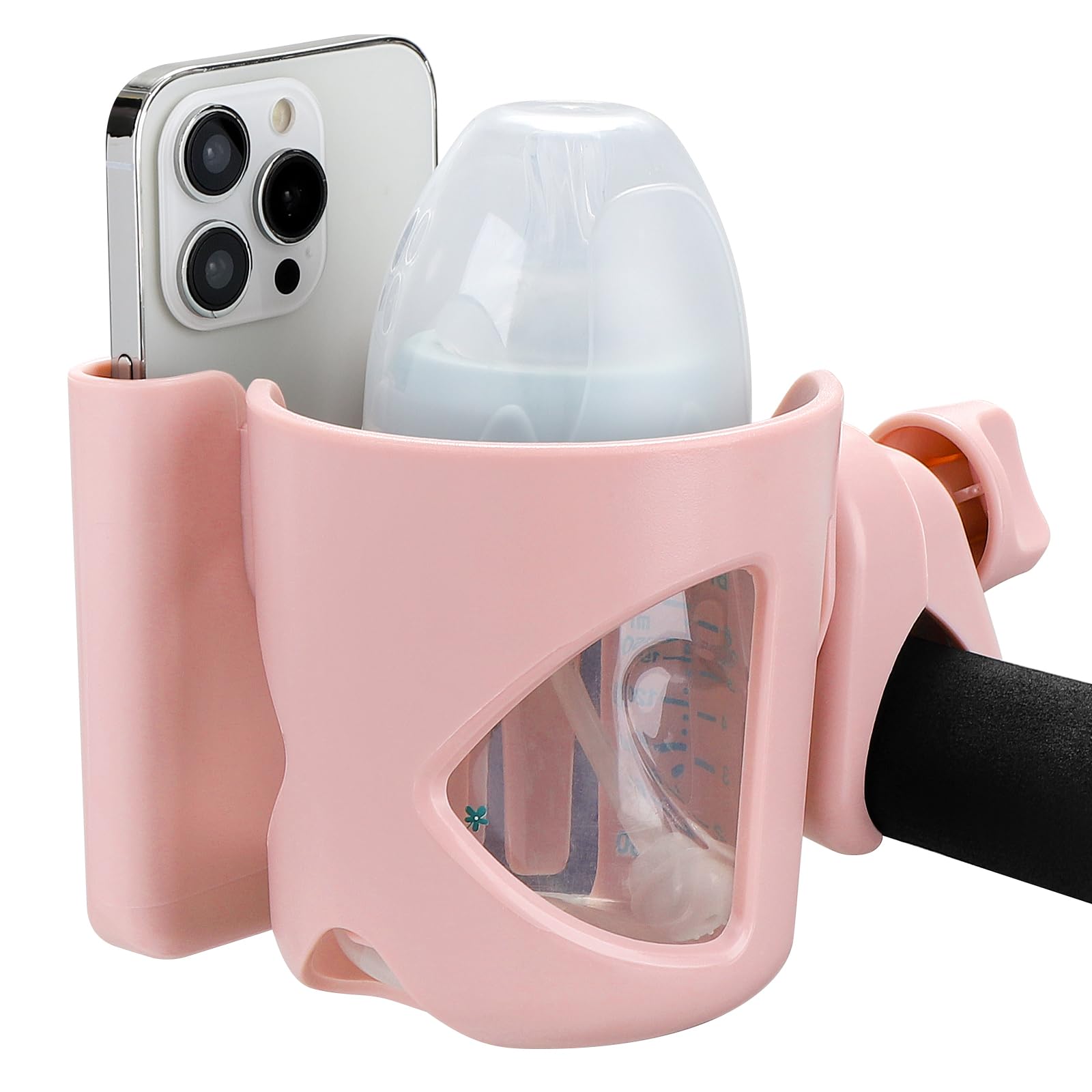 This 2-in-1 stroller cup holder with a phone holder, it can load drinks bottles and cell phone at the same time. You can see new messages, incoming calls in the first time when you are pushing a stroller or running on a treadmill. It is applicable to most cell phones on the market.