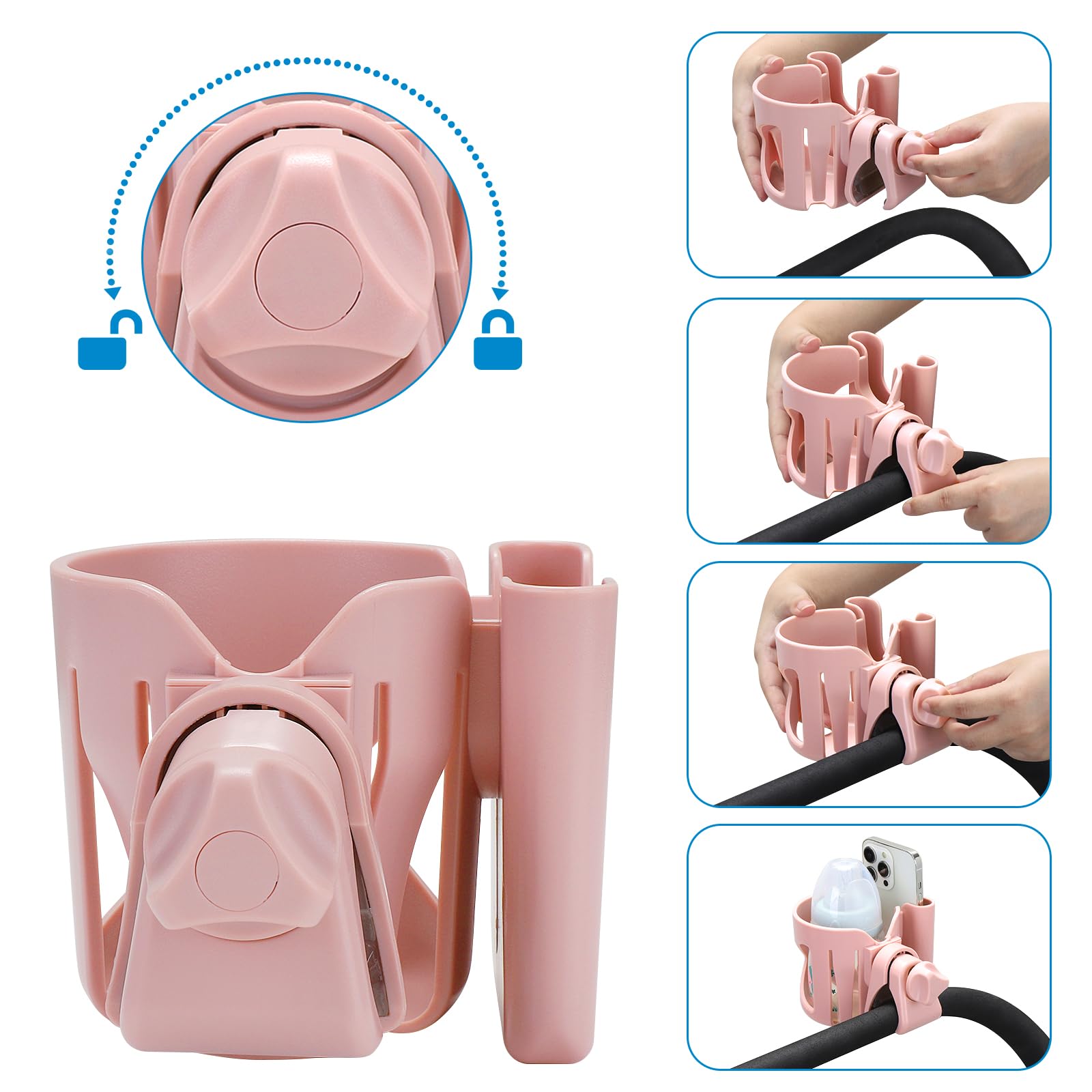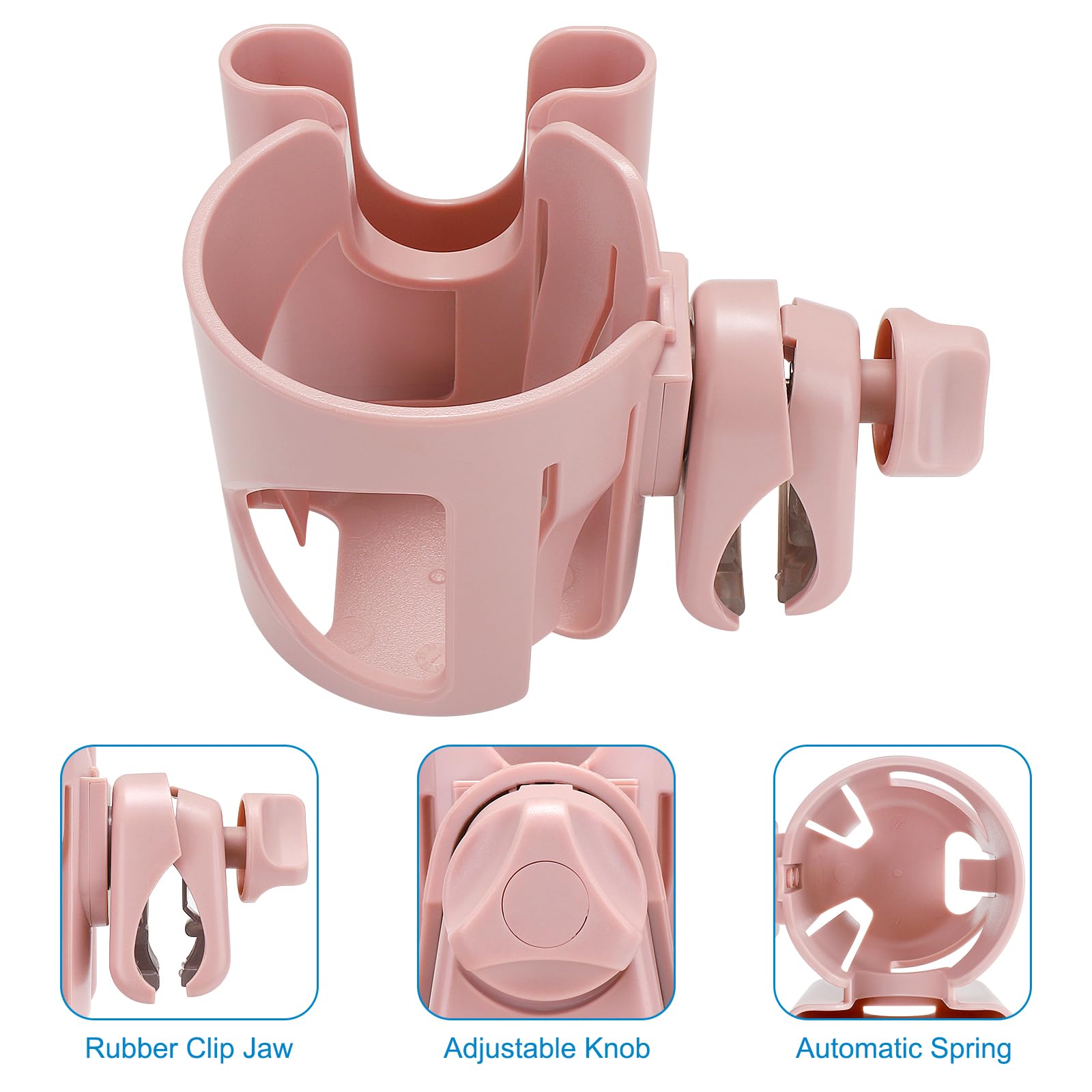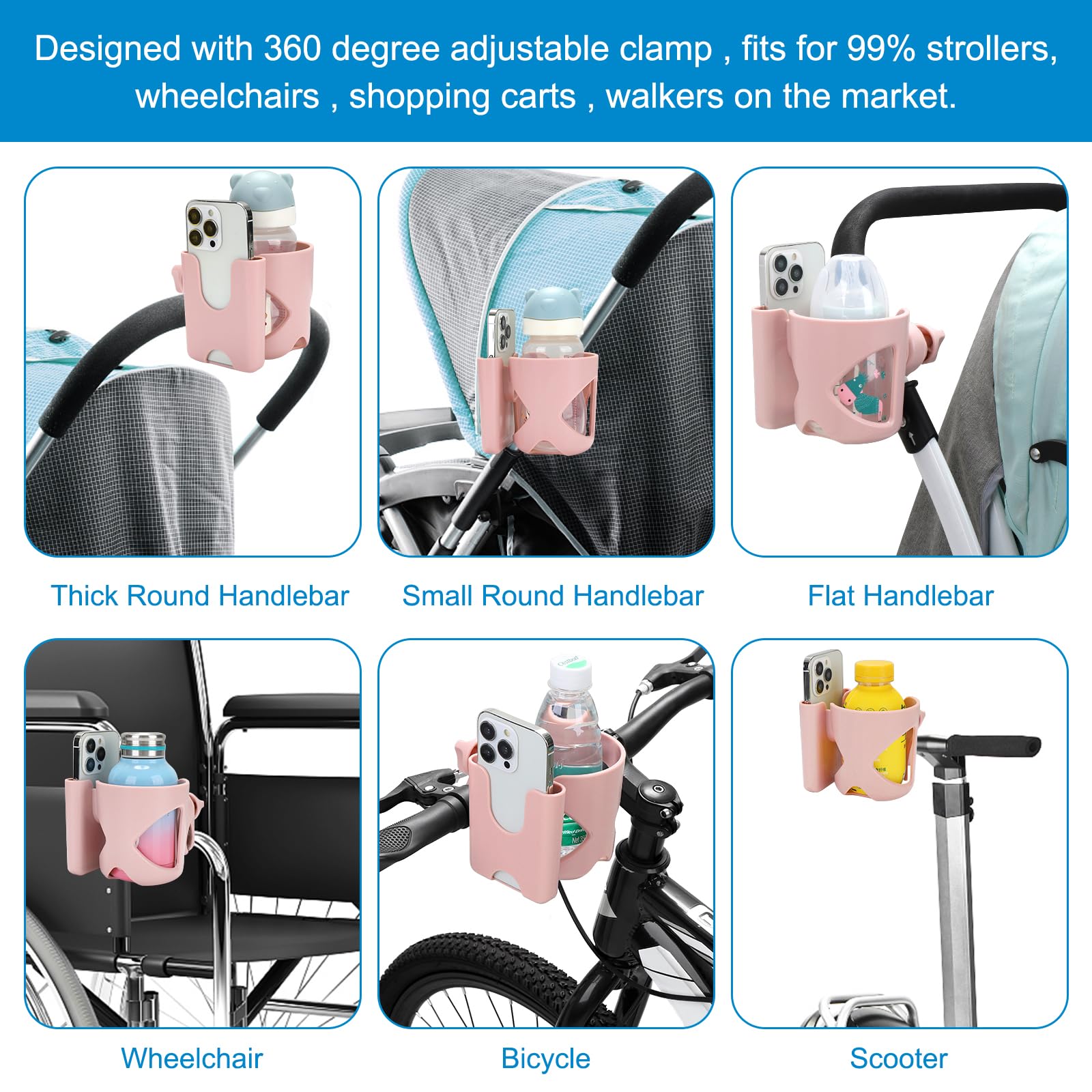 Multifunctional cup holder could be used for stroller, wheelchair, walker, bike, scooter, armrest, trolleys, pushchair, lawnmowers, ATV, treadmill, golf cart, shopping cart, kayak, boat handlebar, motorcycle, beach chair etc.