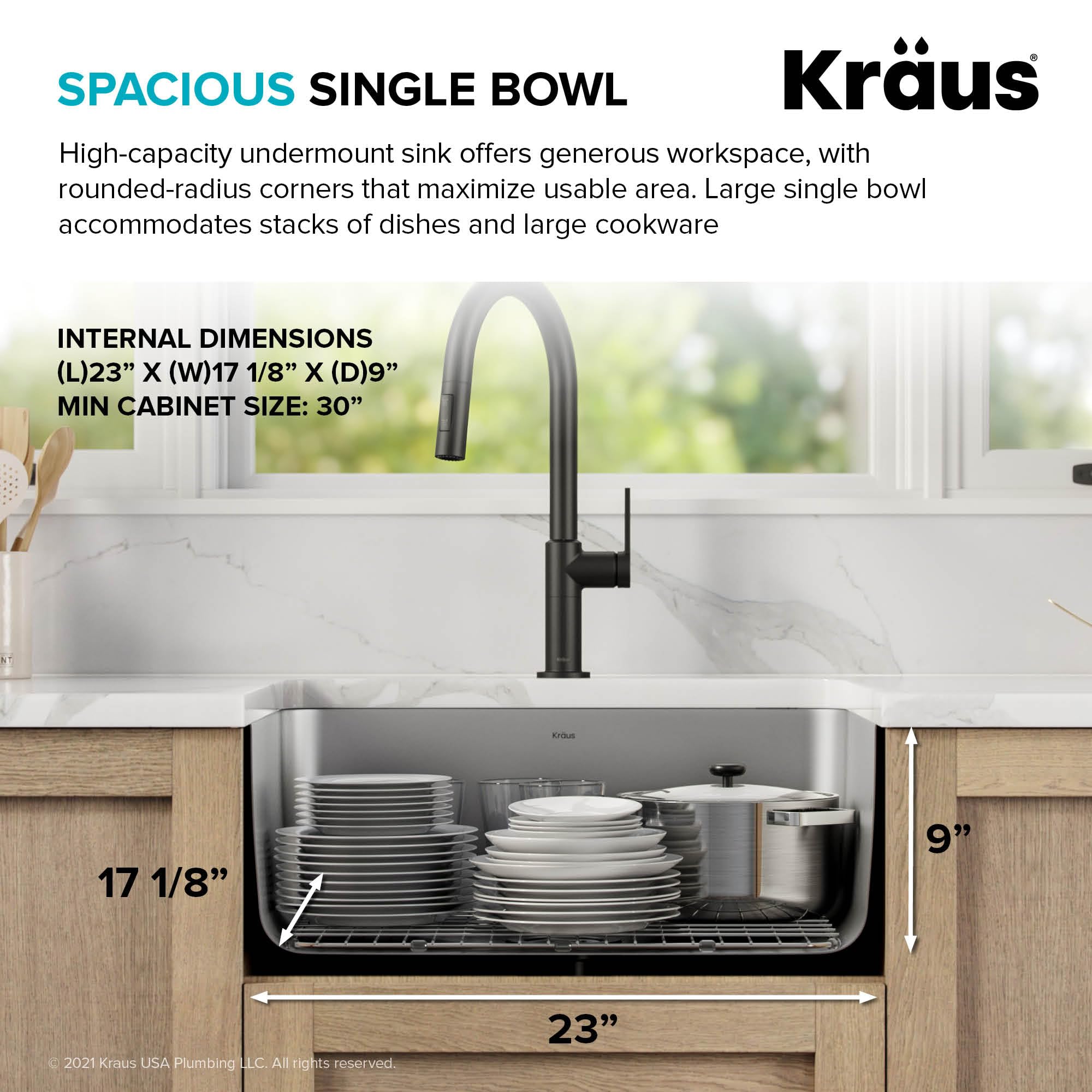 OUTER SINK DIMENSIONS: 24 3/4 in. L x 18 7/8 in. W x 9 1/4 in. D; INNER DIMENSIONS: 23 in. L x 17 1/8 in. W x 9 in. D; Minimum Cabinet Size: 30 in. – SINK KIT INCLUDES: Large single bowl undermount sink, protective bottom grid with soft rubber bumpers, VersiDrain assembly with removable strainer and FlipCap