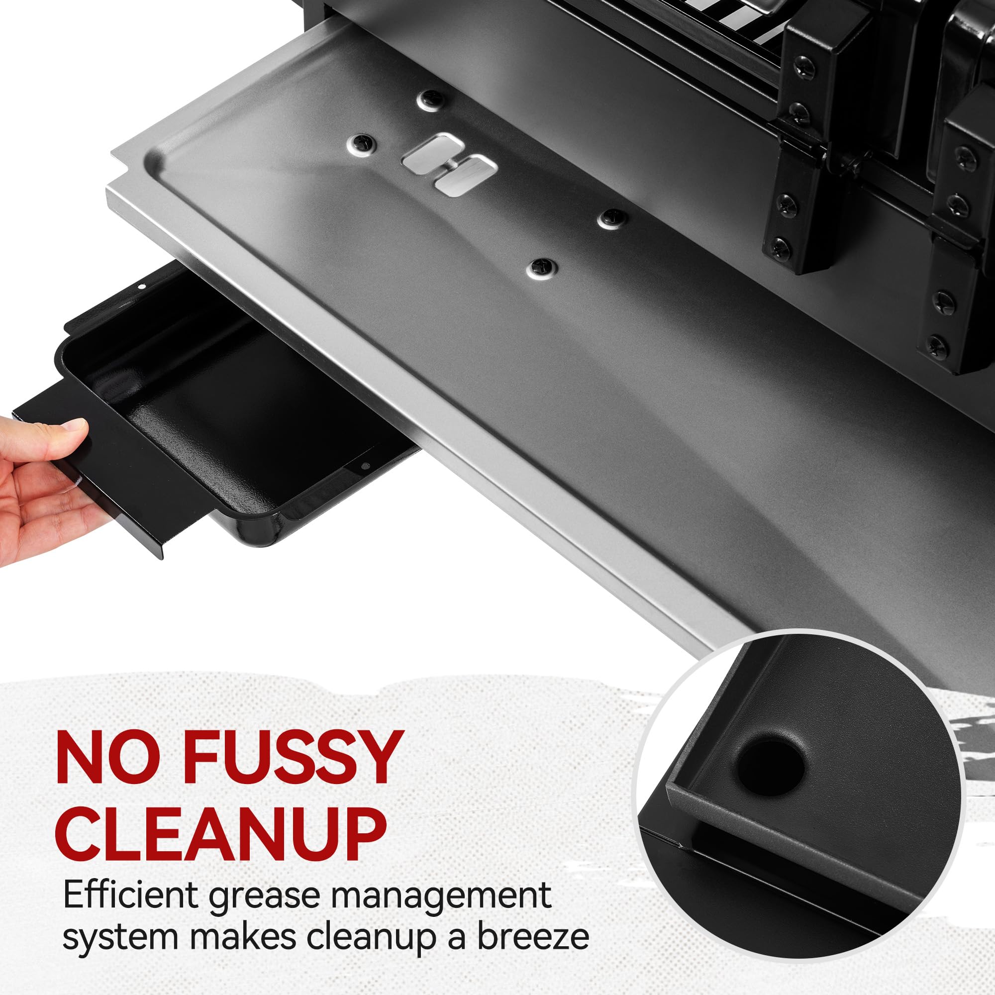 No-Fuss Cleanup: The griddle's oil leak hole, roomy grease tray, and removable grease cup work together to simplify cleanup. This griddle grill combo ensures you spend less time scrubbing and more time enjoying the food you've grilled or griddled