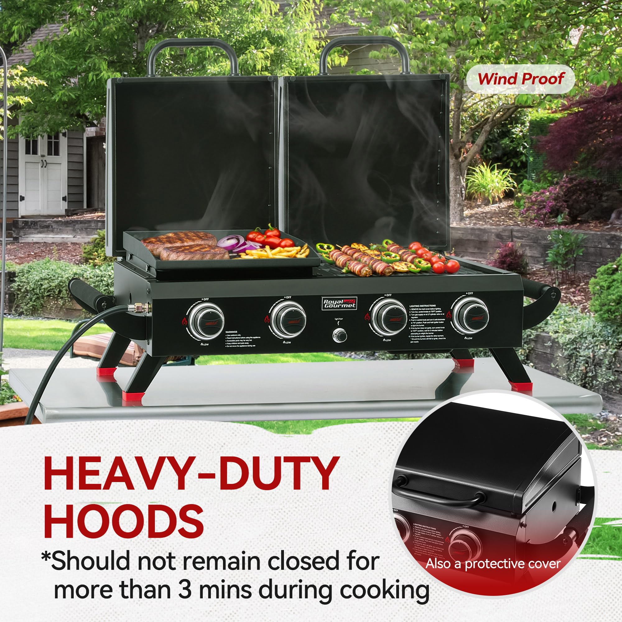 Protected & Stable with Hood Use: Porcelain-enameled hoods shield from wind while cooking (close briefly, max 3 mins) and protect surfaces when stored. Sturdy feet with anti-slip pads keep this grill griddle combo steady on any surface, so you cook with confidence