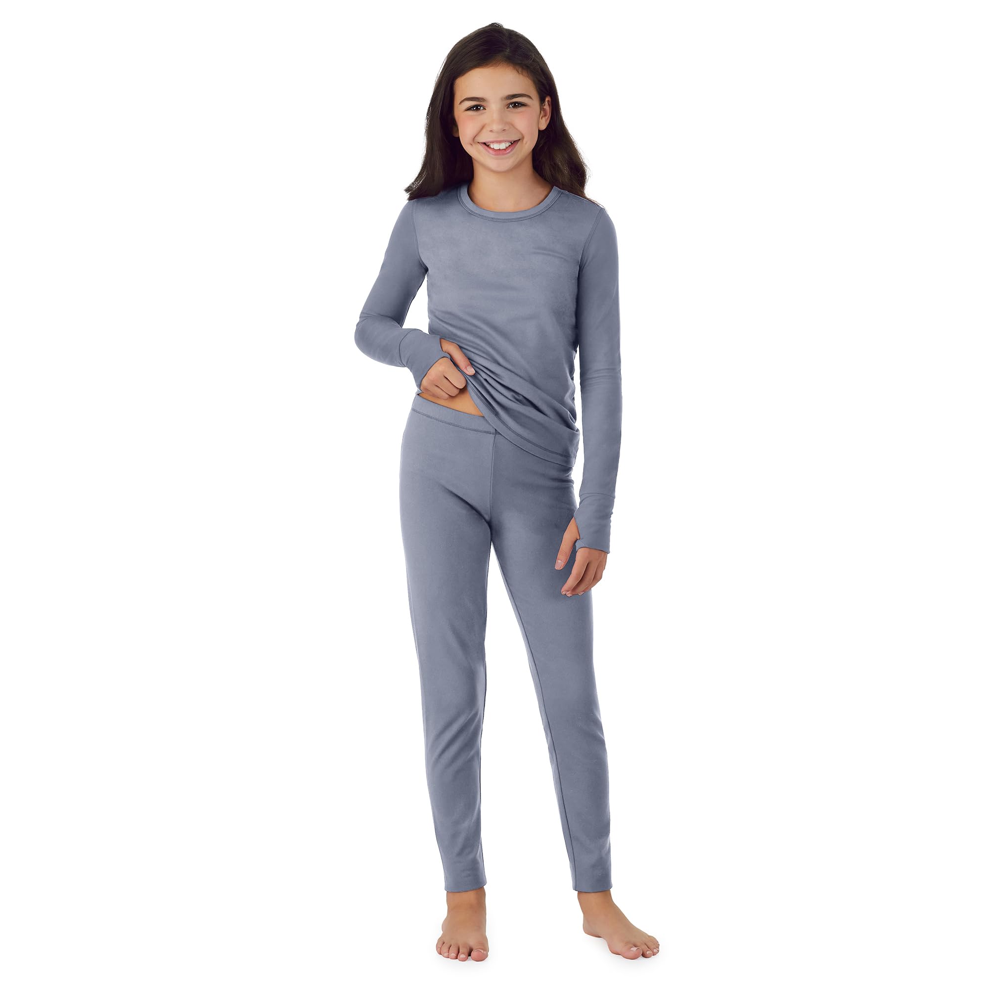 WARMTH IN MOTION: With a close-to-the-body fit, stretchy fabric, and a tag-free design for irritation-free comfort, this set includes a long sleeve shirt with functional thumbholes and easy pull-on leggings. Breathable material lets her move, run, and relax with ease.