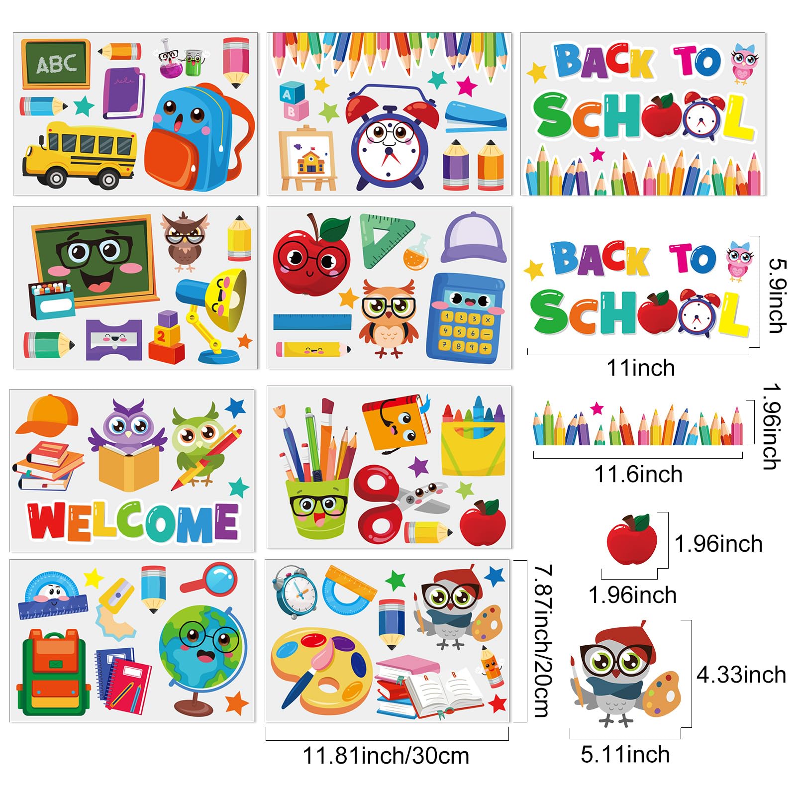 Unique designs: 9 sheets of first day of school decals for windows are designed with different patterns and colors, each sheet measures 20 x 30cm / 7.8 x 11.8inch, printed with welcome, back to school, school bus, owl, pencils, books, etc, you can freely combine to make your decoration look richer and more wonderful, to create a happy atmosphere.