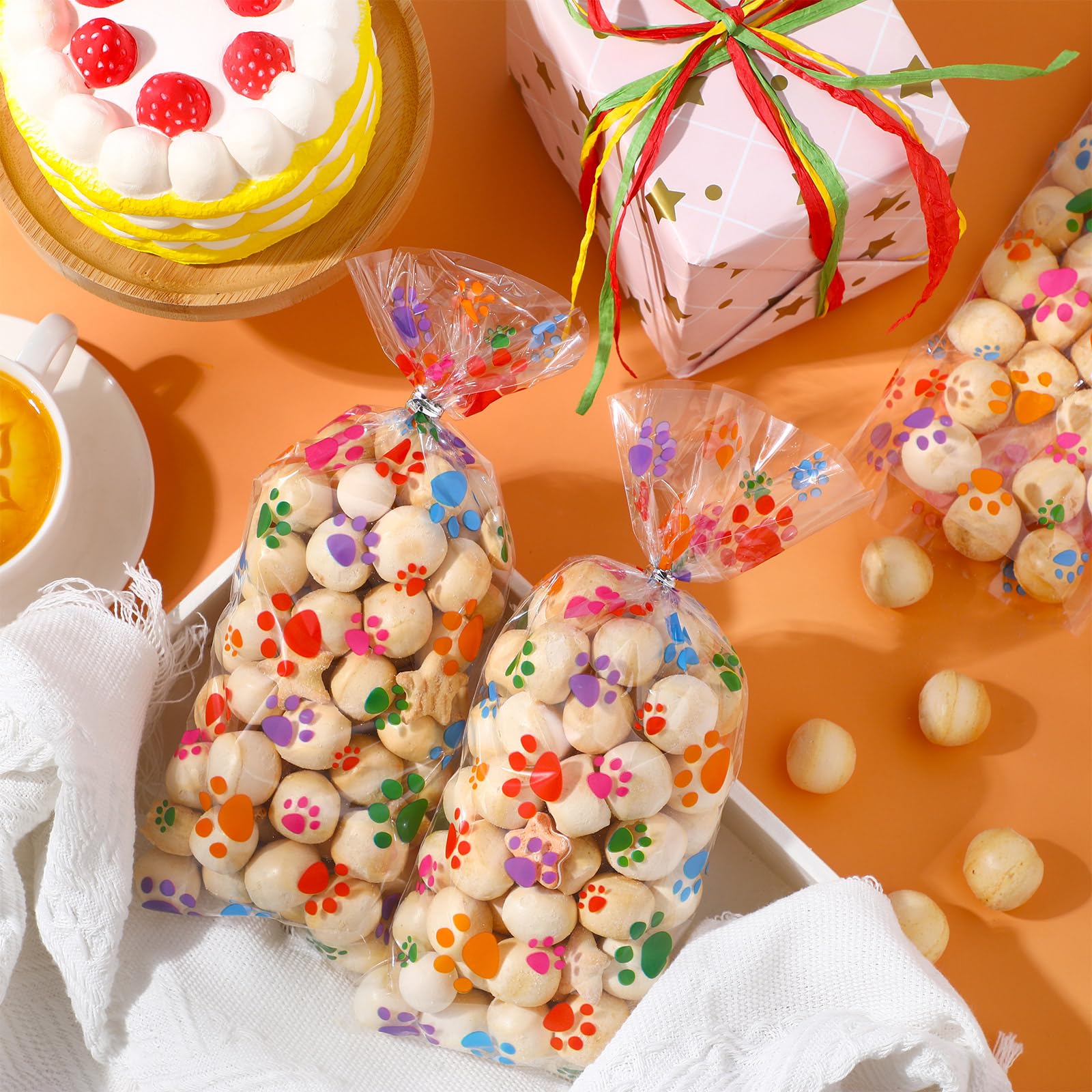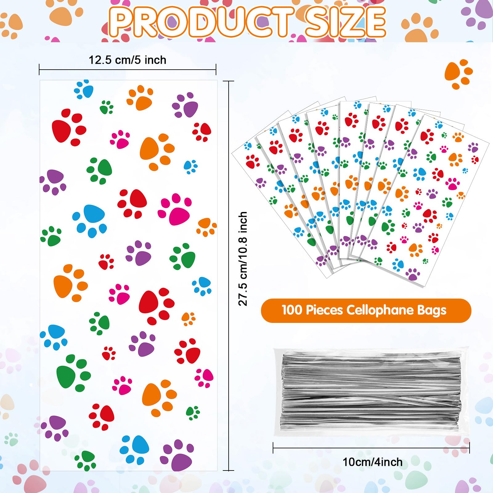 100 Pack paw print patterned cellophane bags heat sealable candy bags gift bags with 100 pieces silver twist ties for pet treat party favor Designs: Each plastic bag is 27.5 x 12.5 cm/ 10.8 x 5 inch, can hold a good amount of candy, then tighten the opening with a silver twist tie. Features: The heat sealable pet gift bags are printed with paw print pattern, these bags can decorate your pet party and make it funny. Wide usage: These paw print bags are suitable for party favors, candy bags, or other gift packaging. Specifications: Color: as the picture shown Material: clear OPP Bag size: 27.5 x 12.5 cm/ 10.8 x 5 inch Twist tie: 10 cm in length Package includes: 100 x Paw print patterned bags 100 x Silver twist ties