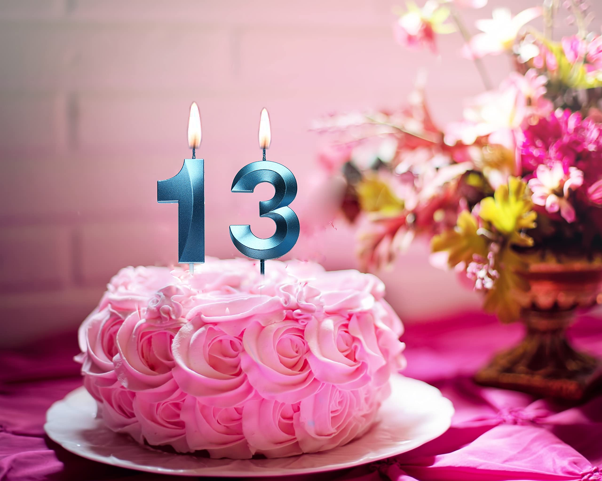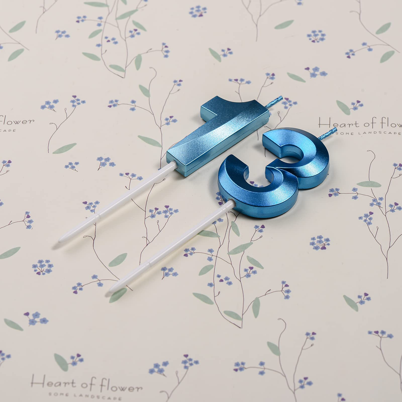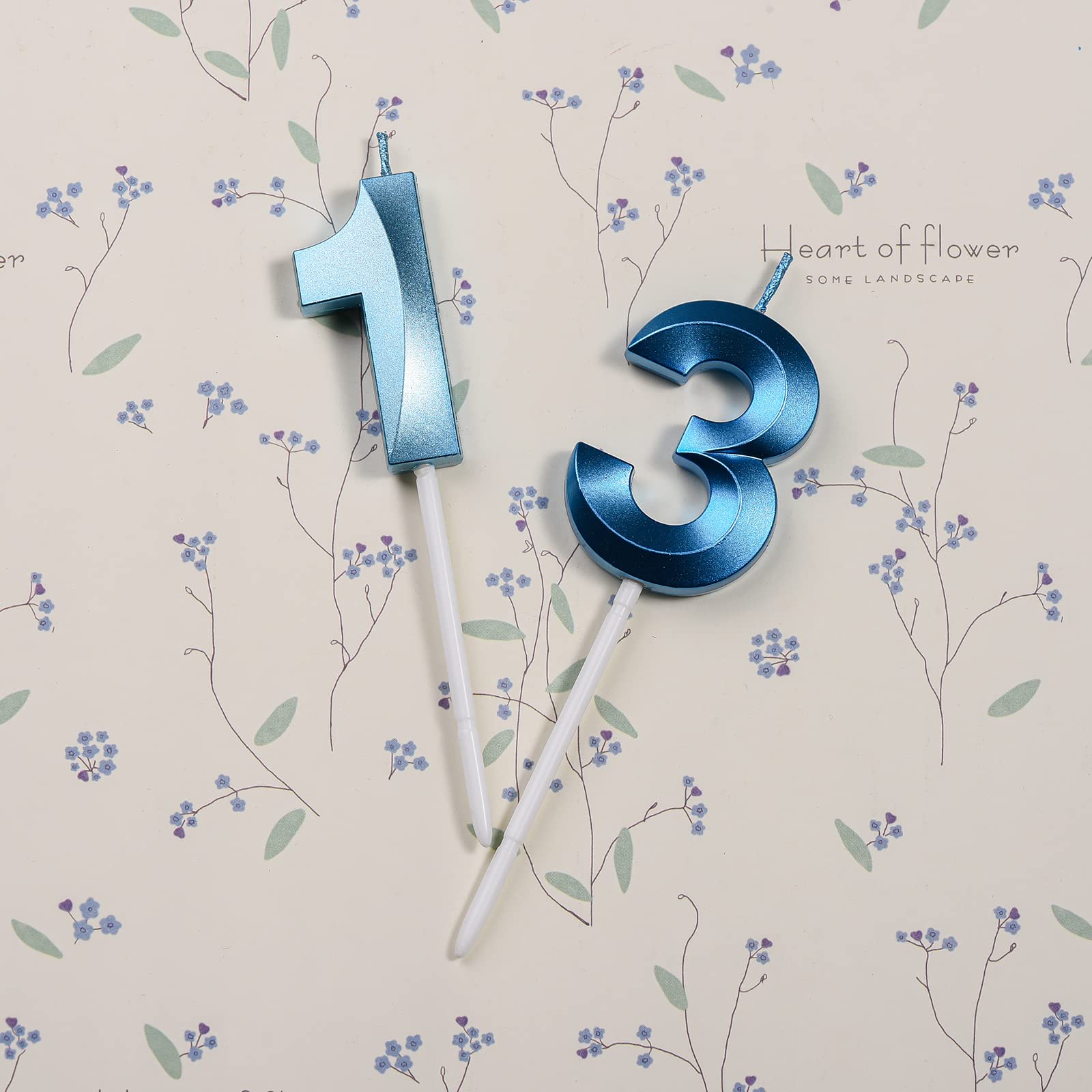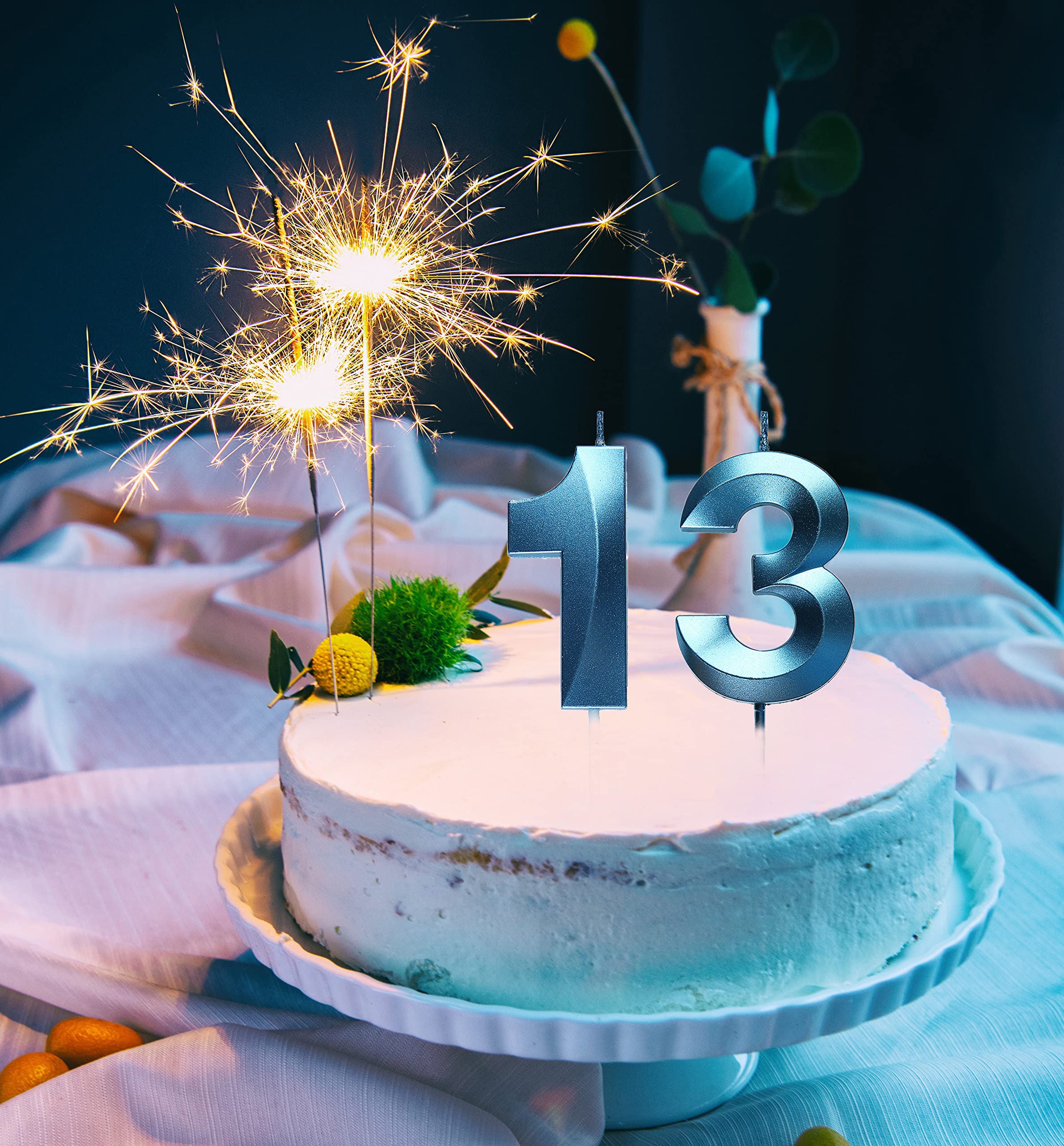 INSTRUCTIONS: Size: Width:1.3 in. Number height: 1.9 in. Total height: 4.8in Color : Glitter Blue Material : quality wax ,smokeless and non-toxic Burning Time :approx 4-5 minutes Package included:2 Pcs ,Blue Number 13 birthday candles PLEASE NOTE: Please keep the candles in shade away from the fire and make sure the size match to your birthday cakes