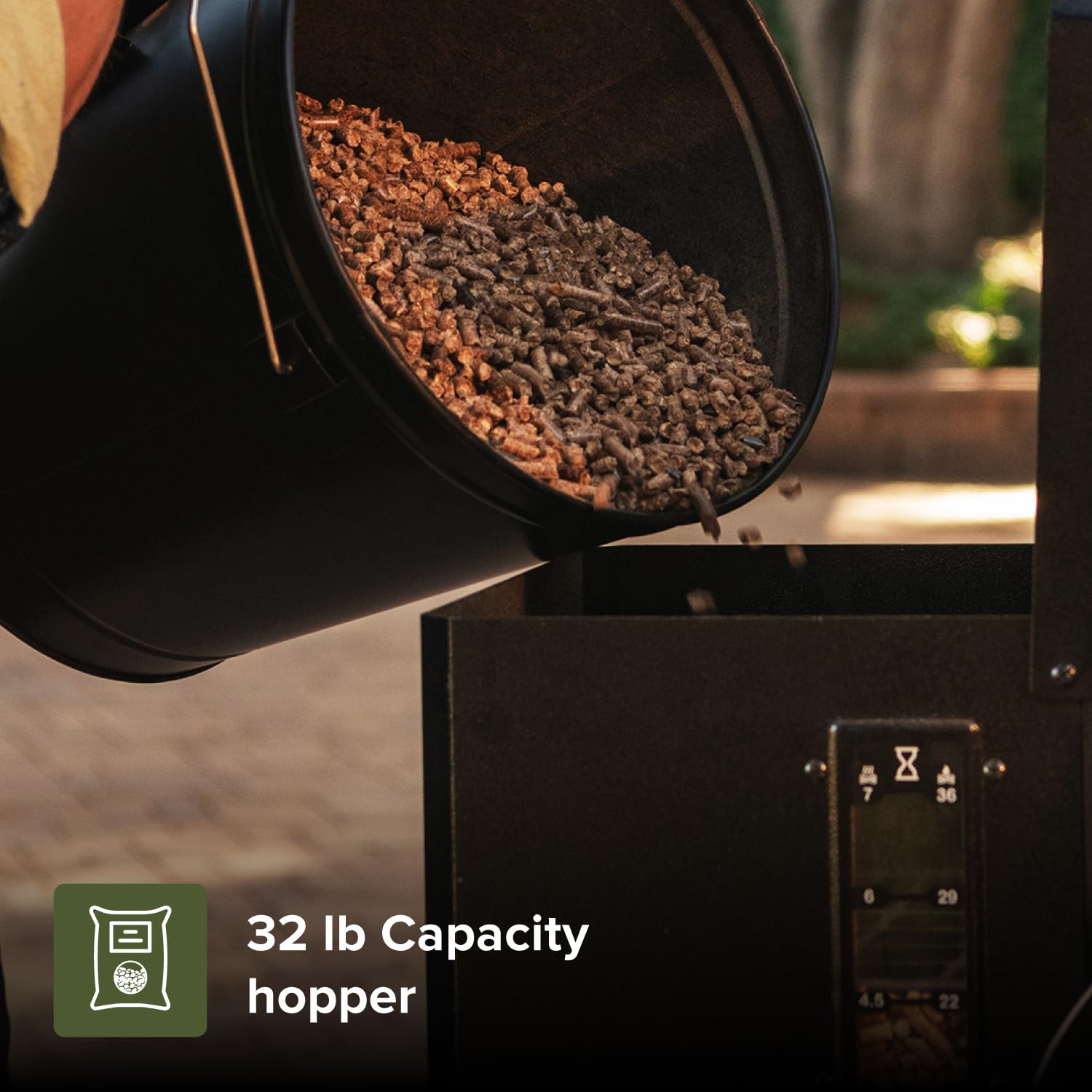 【32 LB HOPPER FOR LESS UPKEEP】 Spend more time grilling and less time refilling with a 32 LB pellet hopper that ensures long-lasting fuel efficiency. The easy-access clean-out door simplifies refueling for smooth and hassle-free operation