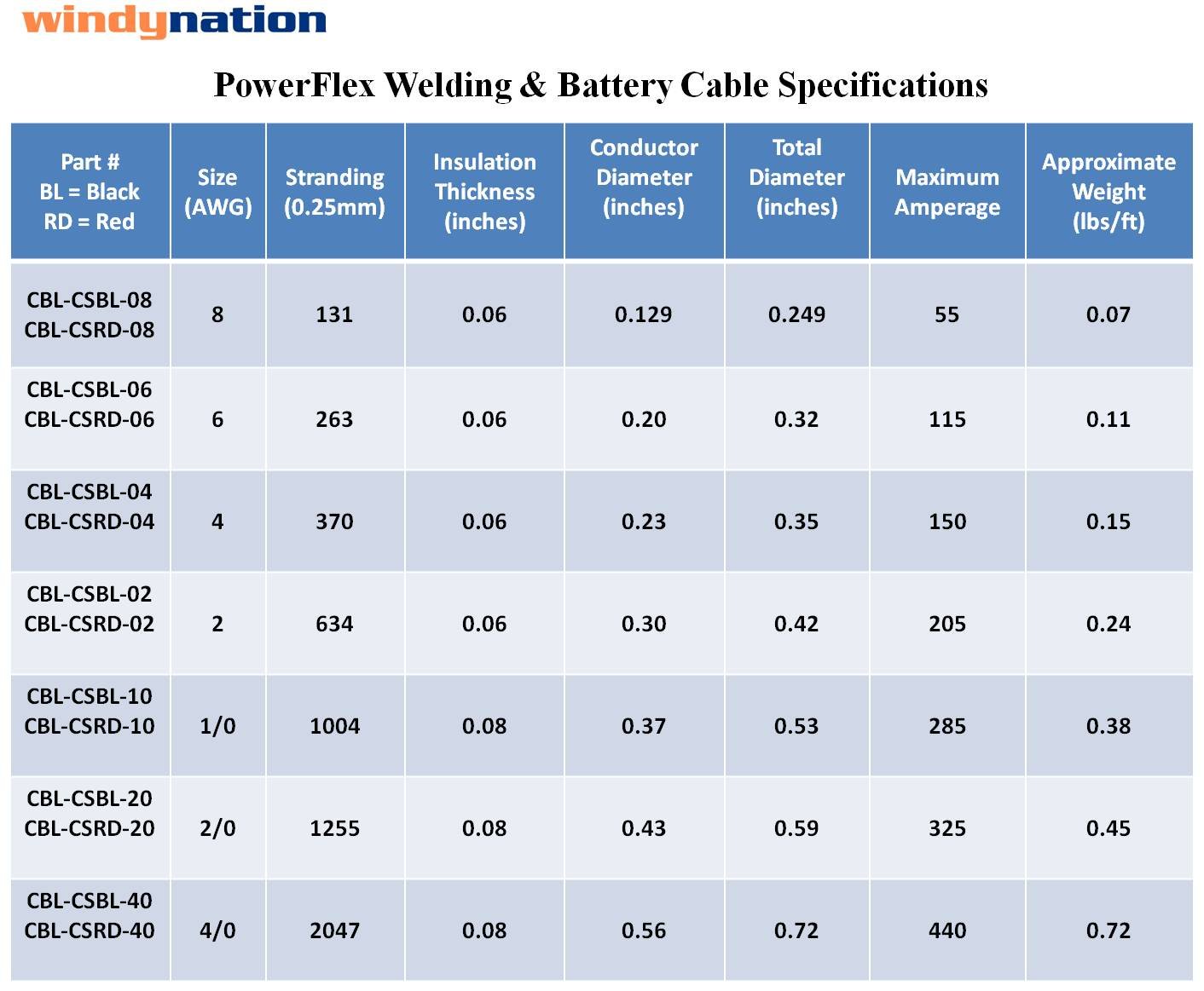 WindyNation Power-Flex Cable is fully annealed PURE copper, flexible (high copper strand count), with a tough, solvent resistant EPDM insulation jacket. REFER TO THE PHOTO GALLERY FOR A DETAILED SPECIFICATION CHART