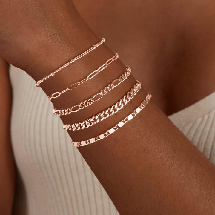 5 Separate layered bracelets:This stackable bracelets for women consists of a 5 style chain bracelets. Including satellite chain/paperclip link chain/mirror chain/figaro chain/cuban chain. You can wear all of them or separate. You have a choice how you wear them for your everyday.
