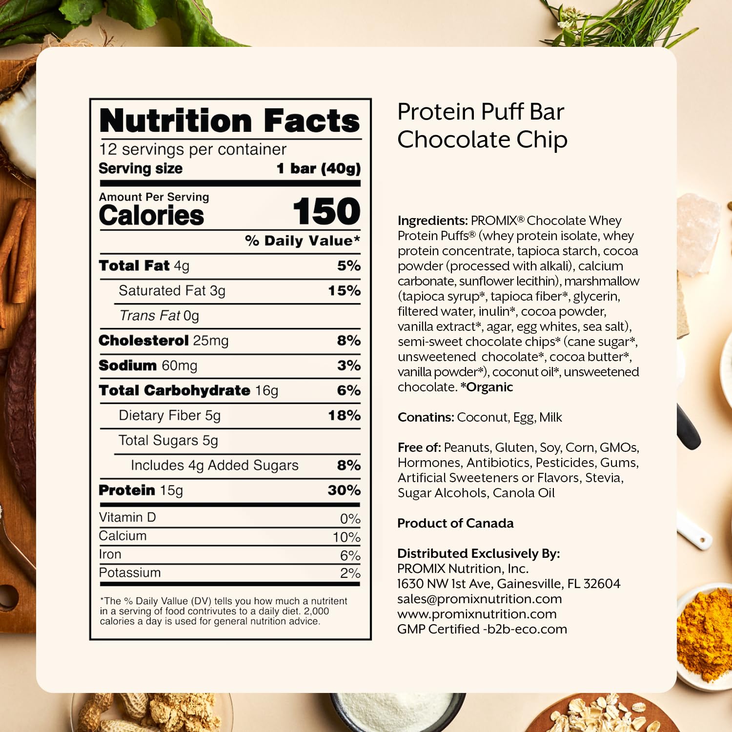 A High-Protein Treat: Promix Protein Puff Bars combine our Whey Protein Puffs and marshmallow for a tasty, rice Krispy-like snack with 15g of protein and just 5g of sugar — 40% less than the leading protein bar. Chocolate Chip flavor. 12 bars per box.
