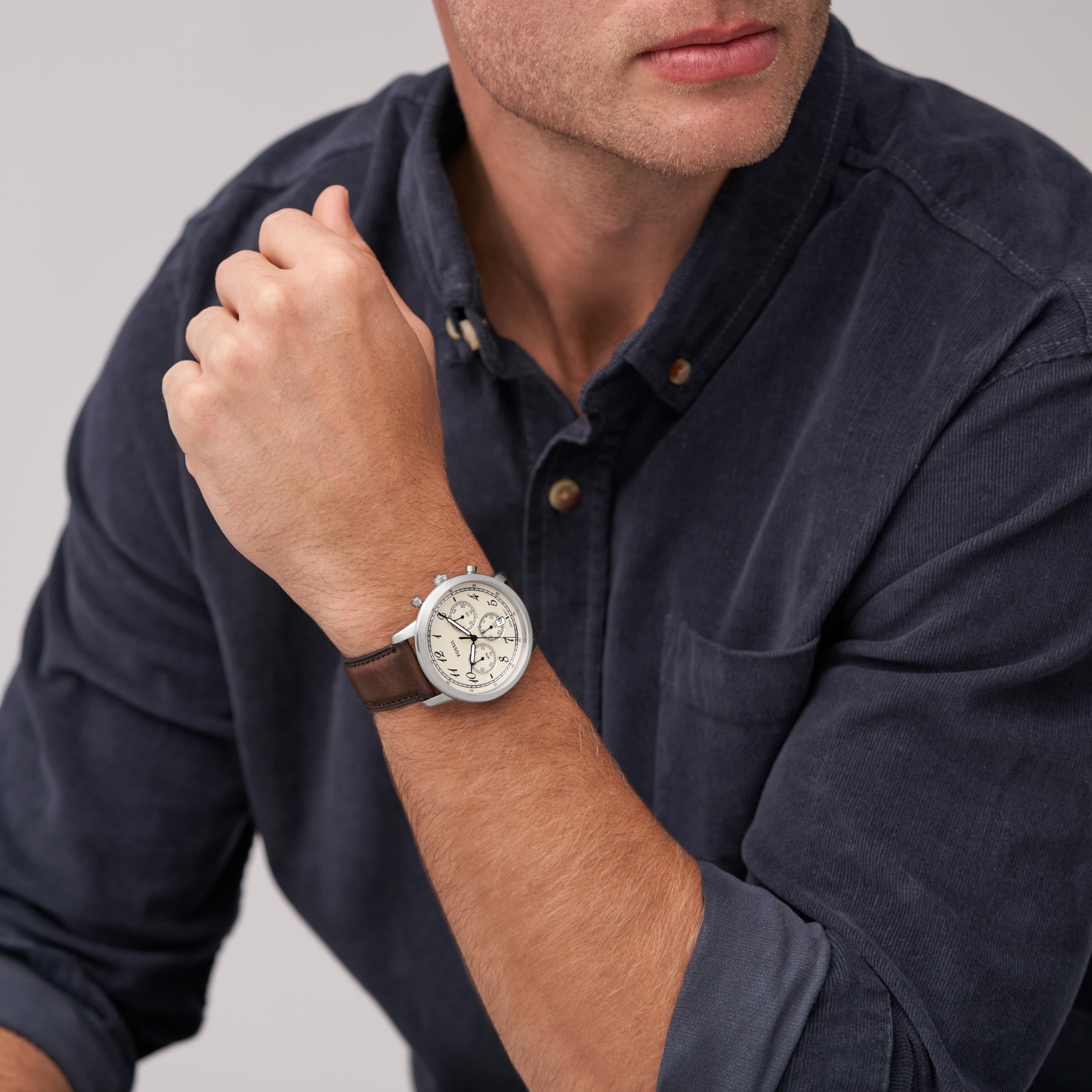 BIG FACE STYLE: This 44mm Neutra features a cream satin dial with Arabic numeral and stick indices, chronograph movement and a brown leather strap. Inspired by mid-century architecture, its balanced proportions deliver timeless style