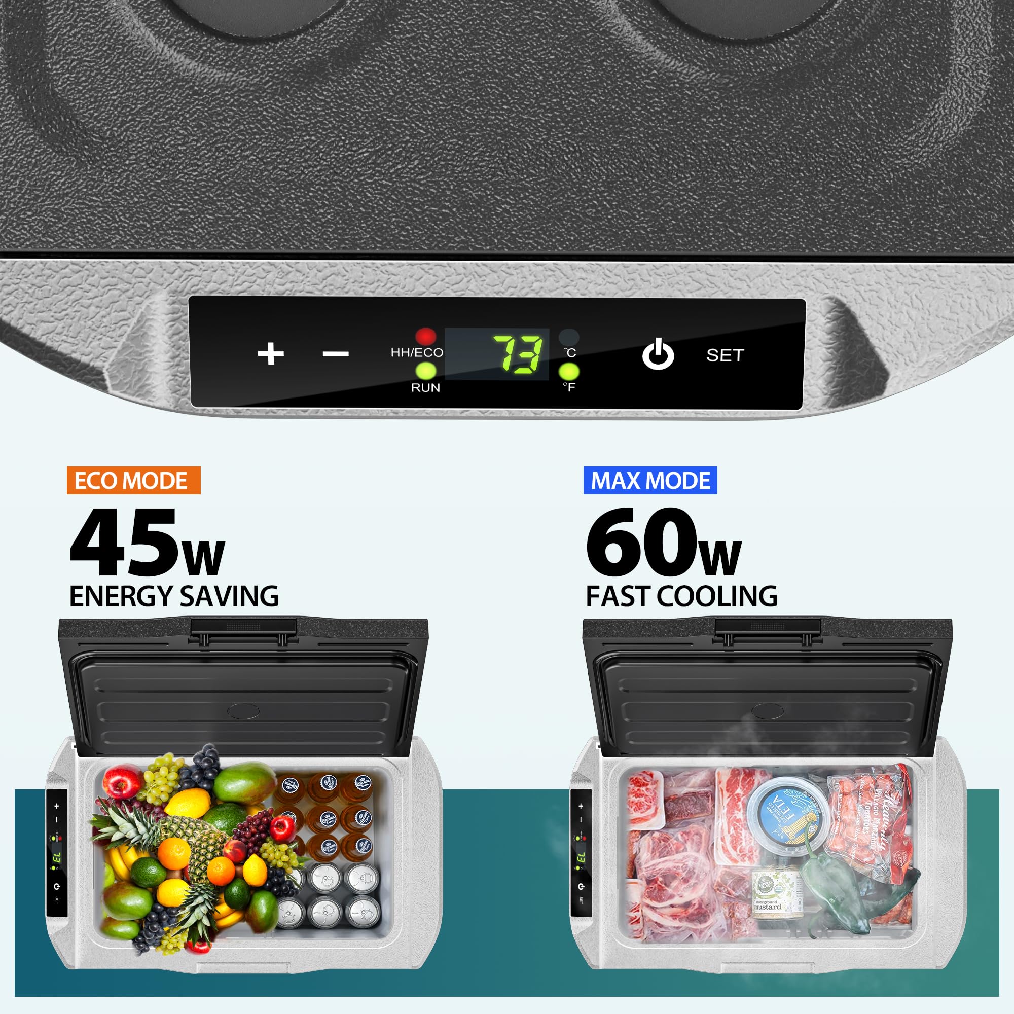 Fast Cooling & Low Energy Consumption; The 12v refrigerator features an advanced variable frequency compressor that cools from 68°F to 32°F in just 15 minutes. The electric cooler offers both an energy-saving ECO mode and a fast-cooling MAX mode, consuming only 45W of power, certified by UL for energy efficiency