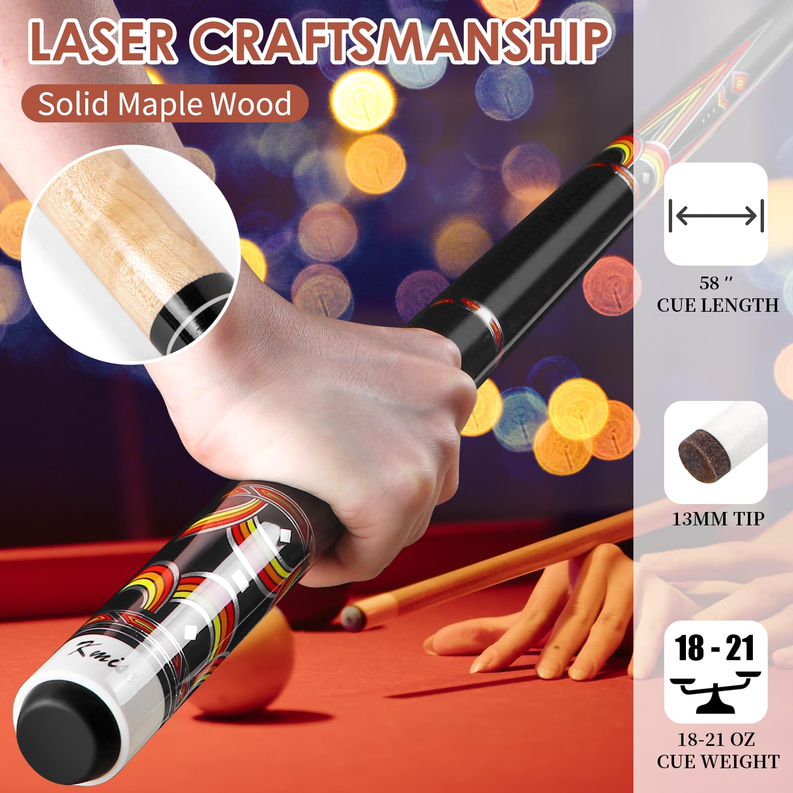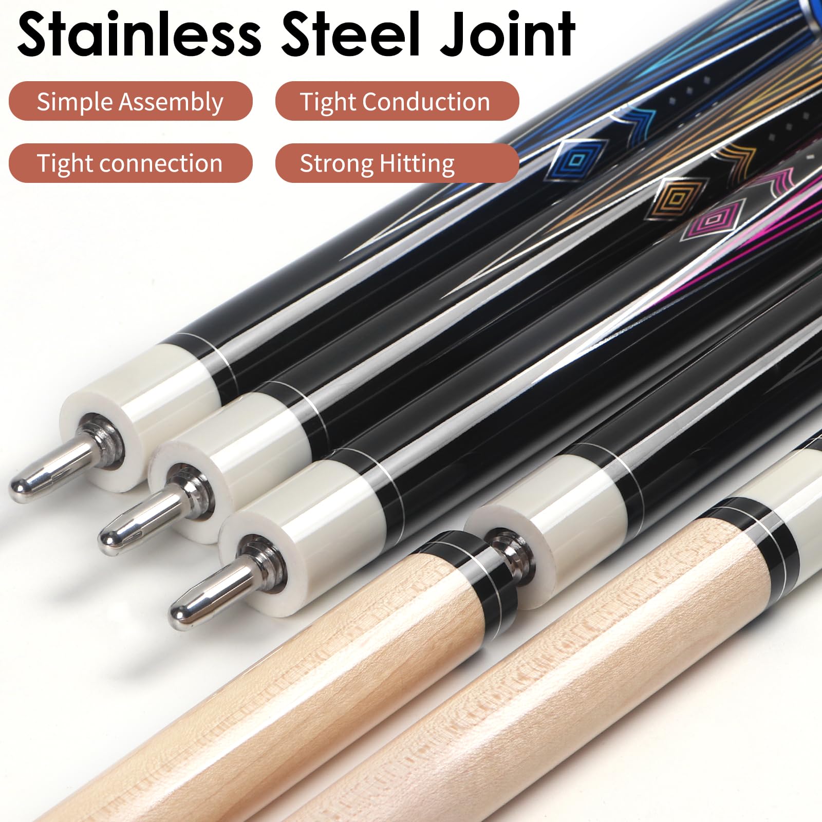 Canadian Maple: Selected solid maple, each cue stick is hand-polished to ensure the shaft is straight, smooth and durable. Stainless steel joints, stable connection, smoother hitting. You will be pleasantly surprised when you shoot billiards with this cue