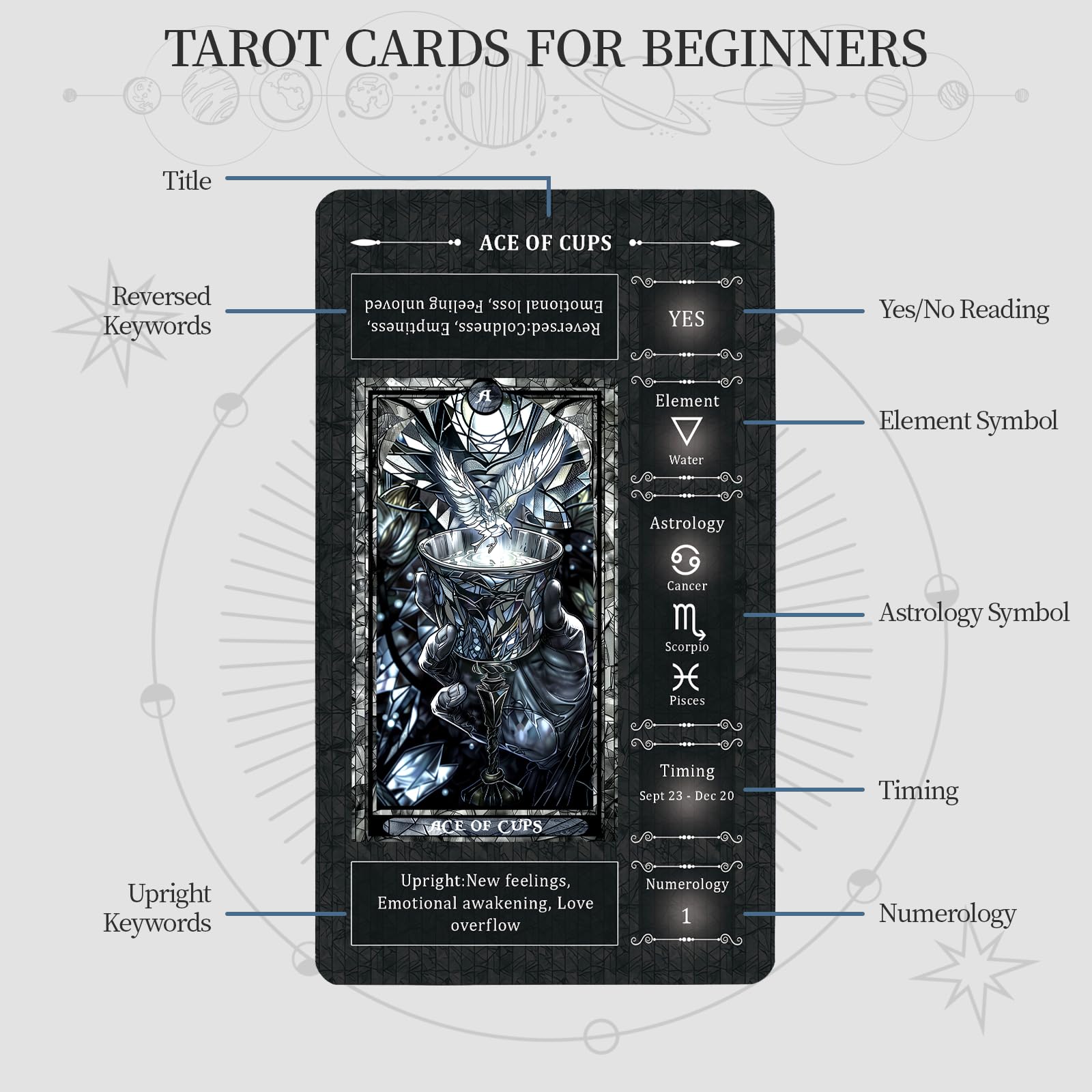 All-in-One Tarot Deck with Meanings & Rich Symbolism: This learning Tarot cards deck beautifully merges stunning stained glass artwork with essential interpretive guides. Each card features not only the unique illustration but also its upright/reversed keywords, Yes/No guidance, and associated Element, Astrology, Timing, and Numerology symbols for incredibly intuitive and insightful readings.